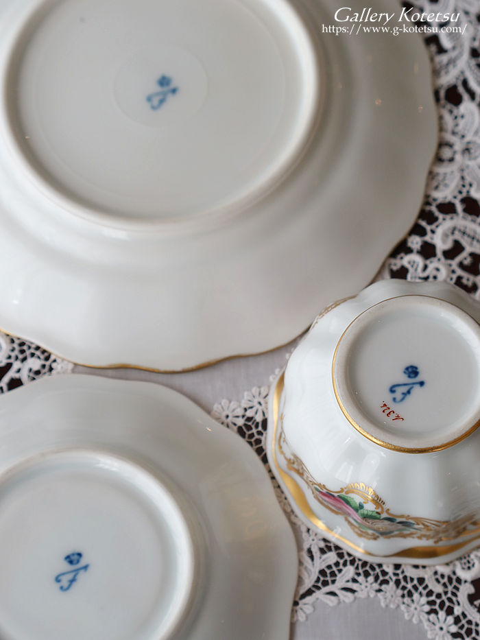 フュルステンベルク窯(Porzellanmanufaktur FURSTENBERG)のティーカップ&ソーサーにケーキプレートが組み合わされたセットです。ドイツ北部ニーダーザクセン州の小さな街「フュルステンベルク」に工房を設立したドイツ7大名窯のひとつです。フュルステンベルクでは、1747年の設立以来、その時代時代の美意識や生活様式を反映した磁器を製作し多角形のシェイプが美しいグレック(GRECQUE)ともビーダーマイヤー様式のティーセットとして1840〜1850年ごろにデザインされました。こちらのティーカップ&ソーサー&プレートセットには縁取りを金彩ぼかしで飾り曲線ライン状に薔薇を二輪向き合わせをロココ調の金彩窓紋様のなかに描かれています。ハンドルのくるりと巻き上げたスクロールハンドルも愛らしい表情です。