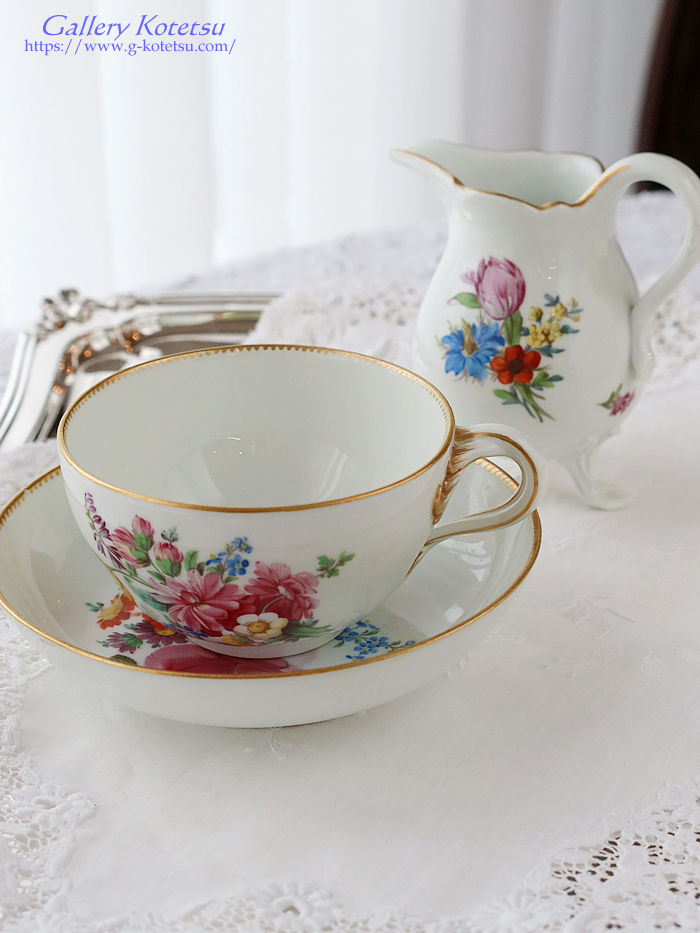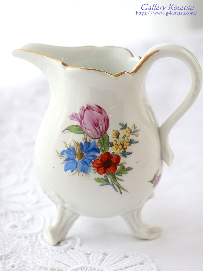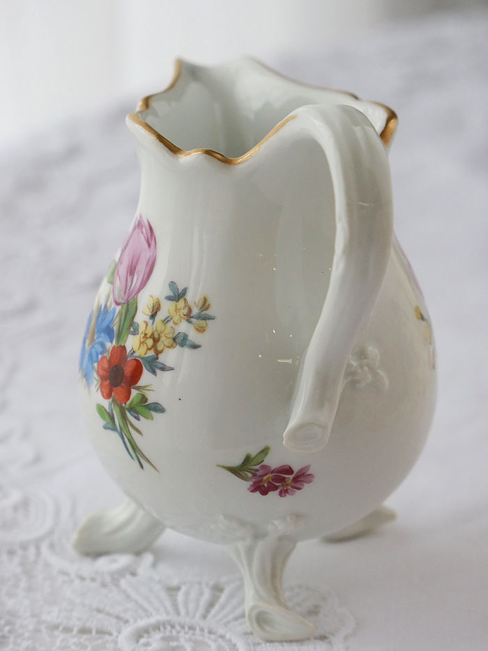 | マイセンのマルコリーニ期に作られましたミルクジャグです。ハンドルを右手にした時と左手にした時に目に留まるフローラルブーケがそれぞれ異なる花々を描かれいます。