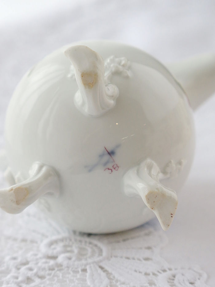 そのうえフットのスタイルからハンドルの小枝ラインにご注目いただきますと小花が浮き上がる塑性技法で愛らしい飾られフット装飾にも自然な小枝の動きをナチュラルに表現された技法がマイセンのマルコリーニ期の技です。 |