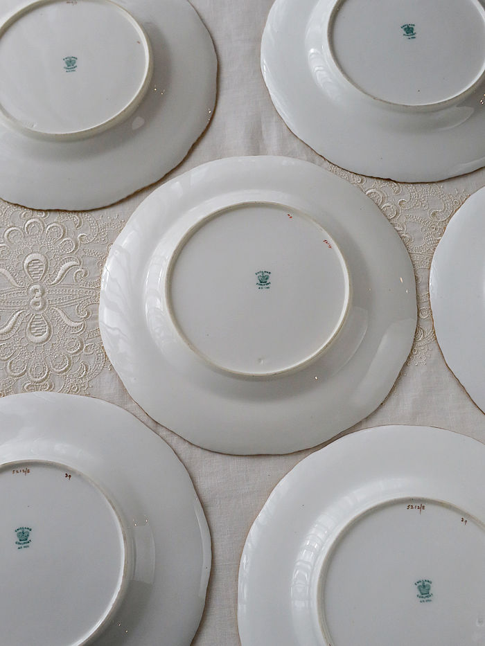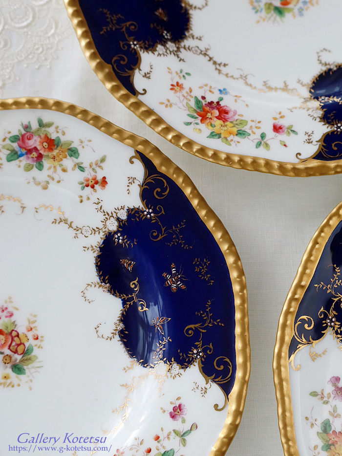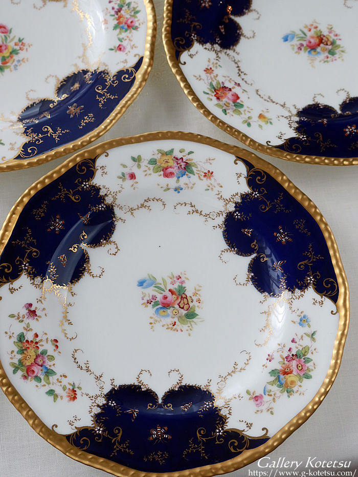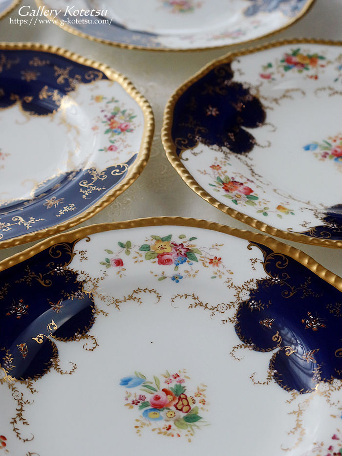 | 英国コールポート窯デザートプレート直径230mmの6枚セットです。コバルトブルーと白磁を重ねたうえにプレートの縁取り部分を厚みのある金彩縄編み紋様で飾られています。中央部分から三方に広がる白磁窓紋様の中央部分を風にたなびく愛らしいイングリッシュガーデンブーケを飾りコバルトブルー地の窓紋様に描かれたミツバチと小花紋様をホワイトエナメルジュールで立体的に仕上げ金彩エナメルのスクロール紋様で上品に仕上げています。イングリッシュガーデンティータイムをイメージするイングリッシュローズをはじめとした花々が愛らしいデザートプレートセットです。 |