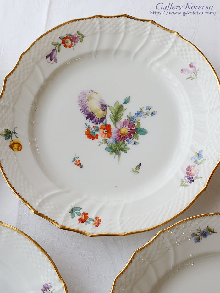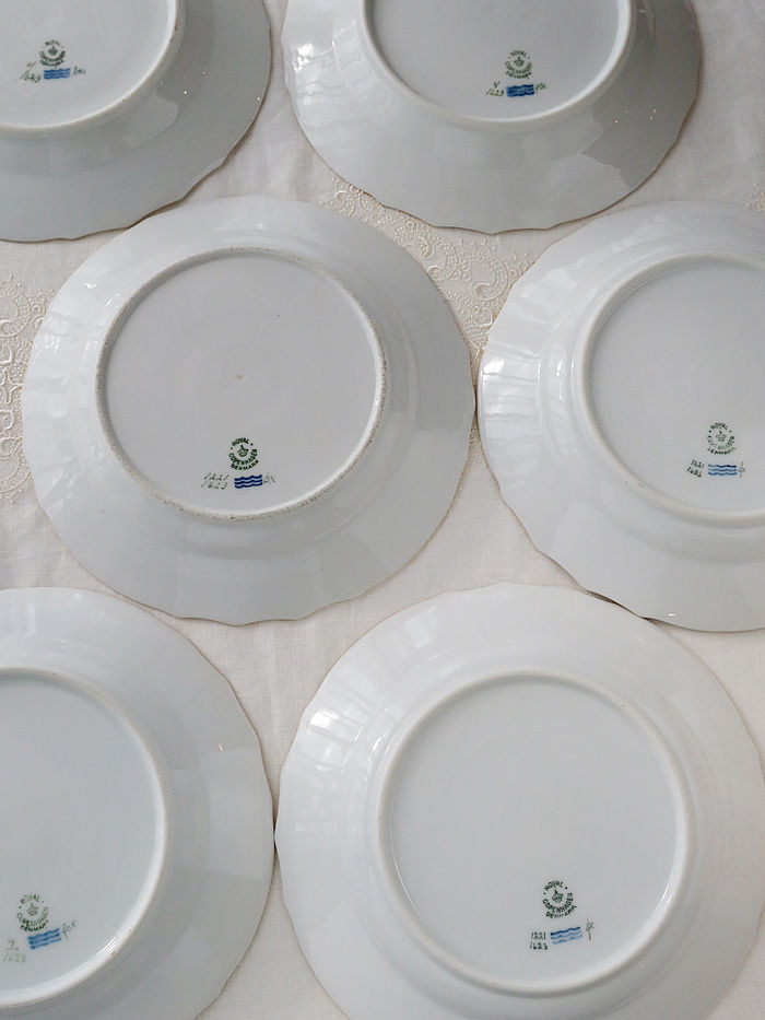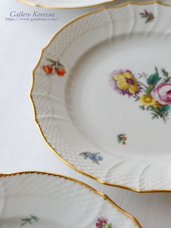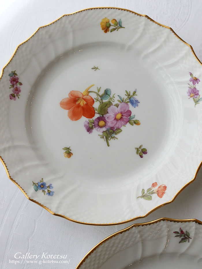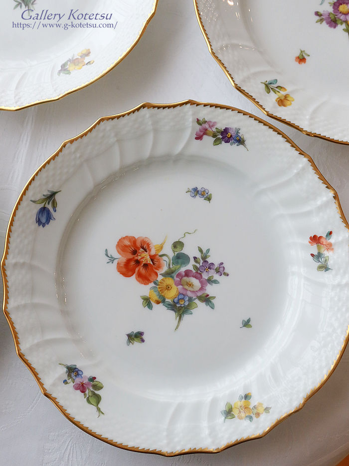ロイヤルコペンハーゲンのSaxonFlowerシリーズから直径22pのデザートプレート6枚セットです。 ロイヤルコペンハーゲンの独特な色絵付けで描かれたフラワーブーケ紋様に金彩の縁取りをラインのみのライトから筋状紋様を縁取ったリッチタイプです。時代も1936から52年に製造された年代マークが記されています。