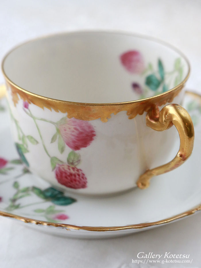 | ムラサキツメ草を描いたティーカップ&ソーサーです。 C.1890年フランスのリモージュTressmann&Vogtが描くムラサキツメ草がナチュラルにのびた茎から葉へと自由自在に咲き誇る様子をティーカップの外側から内側&ソーサーに描いています。ティーカップの口元部分&ソーサーの縁取りを金彩エナメル彩で飾っています。さらに金彩で覆われたハンドルカーブも持ちやすく模られています。