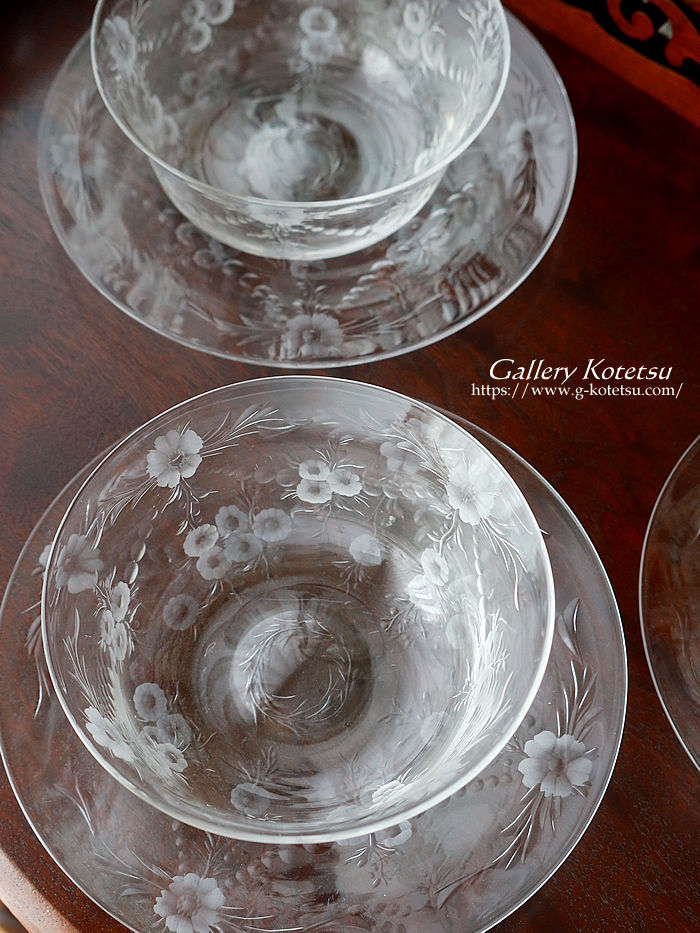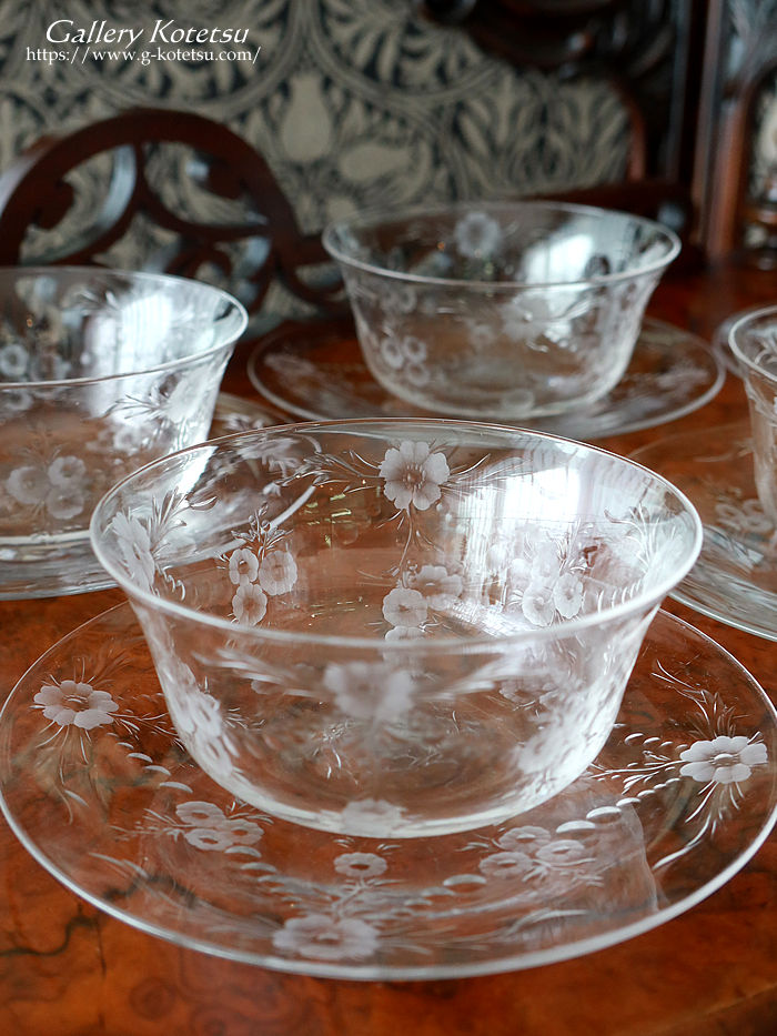 | 英国のグラス工房スティーブンウィリアムスが仕上げたボウル&ソーサー6客セットです。 ナチュラルなグラヴィールで仕上げた花の精を思わせる幻想的な表現方法に思わず目がとまります。口径をゆったりと仕上げたグラスボウルに合わせるように仕上げられたソーサーを重ねますとガーランド紋様が浮き上がりセッティングが際立つ美しいボウル&ソーサーセットです。
