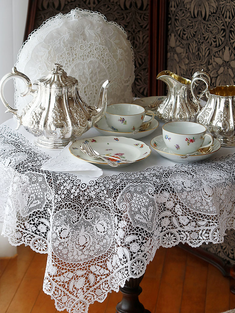 | 「アンティークシルバーのある暮らし」をご提案するなかで、お茶の時間にお使いいただきたいティーナプキンやドイリーをティーカップ&ソーサーに