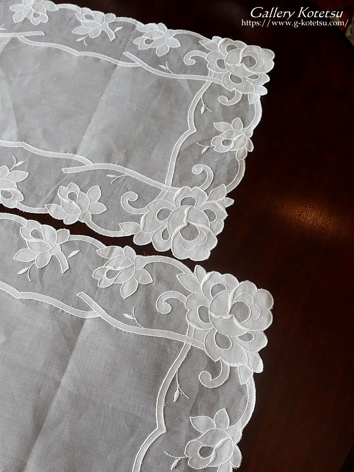 プレイスマットに程よい大きさです。ホワイトカラーのオーガンジーにテーピングで縁取ったうえにポイントごとに薔薇の輪郭を刺繍の凹凸紋様で華やかせたプレイスマットです。※オーガンジーのプレスが足りず折目が少々残っています。