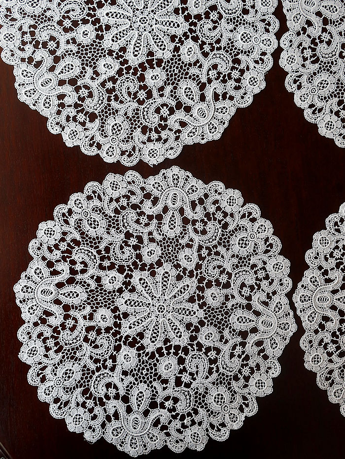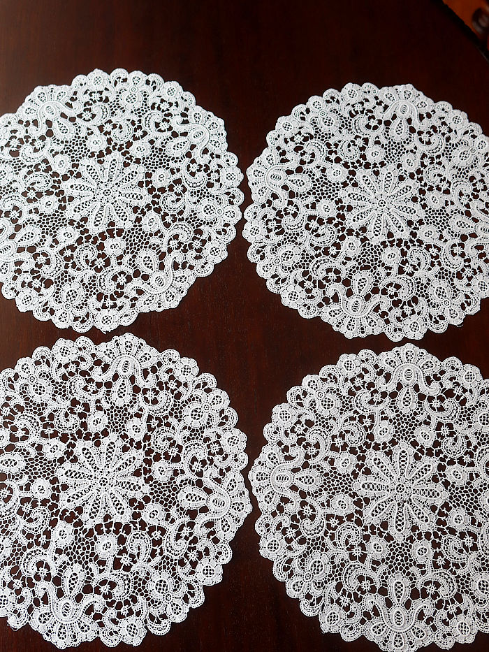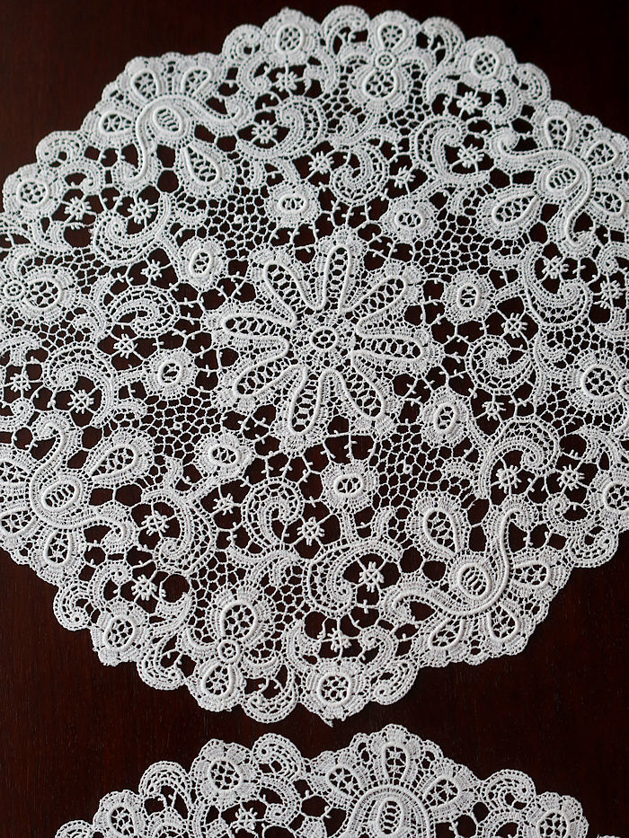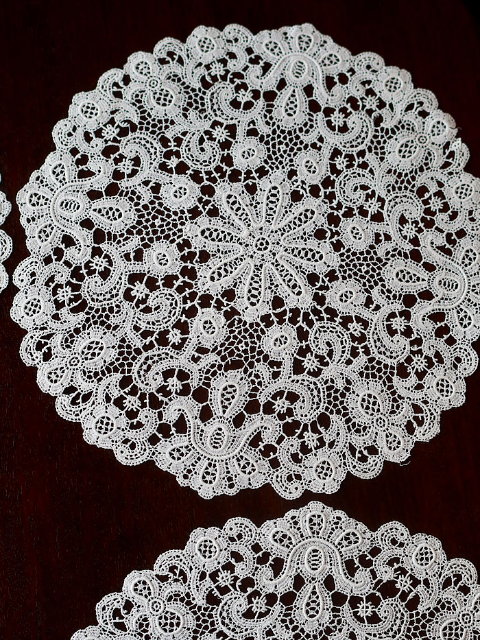 ニードルレースで中心の花びら文様からペイズリー紋様を重ねた中にアルメニアレースレースの糸を結ぶ円環紋様へと広がりを持たせた緻密な技法が魅力的です。