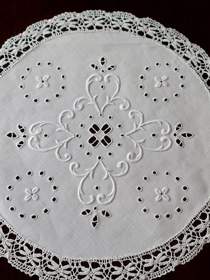 ホワイトリネンのラウンドレースを飾る立体的に仕上げた刺繍とカットワーク刺繍を中心に飾り縁取り紋様を方形の緻密な積み重ねを編み目で飾られています。サルヴァやトレーなどに重ねられますと刺繍が引き立ちます。
