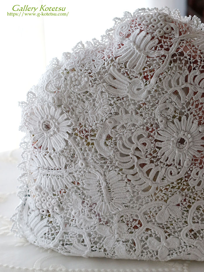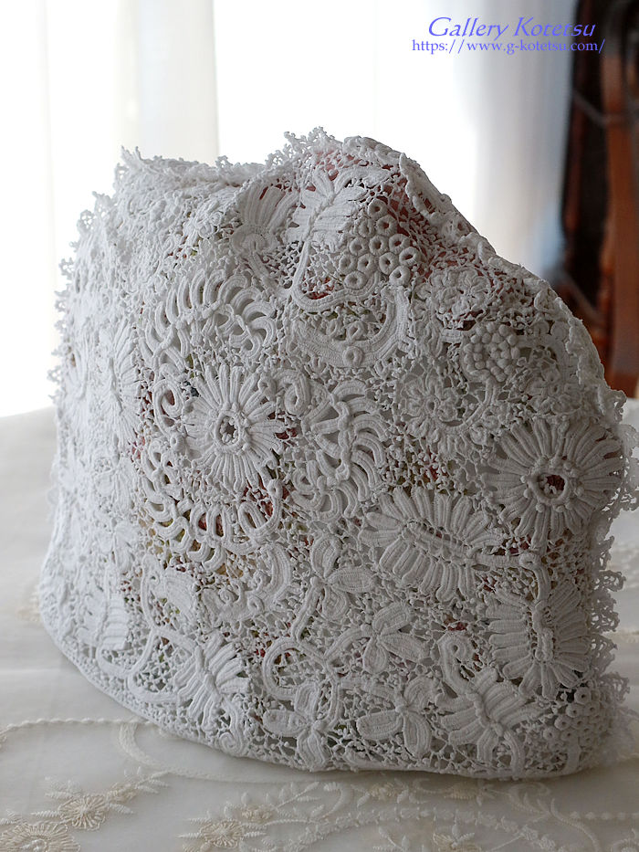 | アイルランドの美しいアイリッシュクロッシェを優雅で大胆なモチーフで編み込まれたティーコージーです。フランスからアイルランドに伝えられたとされます鎖編みの上に小花を飾ったかぎ針手法で薔薇&シャムロックなどバランス良く全体に飾られています。イギリスのレースの中でも独特なモチーフで仕上げた胸元を飾るレースを多くみられます。ティーコージーの左右&上下と緩やかに広げられますので平面サイズのリネンよりも若干膨らみを出せます。※レースのティージーカバーに合わせた中綿クッションを重ね保温性を高めてください。
