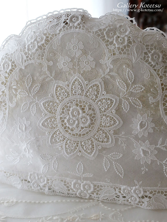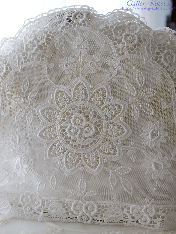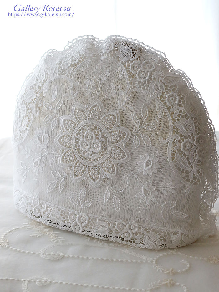 ホワイトカラーの様々な手芸レースで仕上げたティーコージーです。中央の円環紋様を中心にチュールレースで重ねた幾種類もの花々紋様で飾り全体を囲むようにフローラルモチーフをアプリケット仕上げで縁取られています。※レースのティーコージーカバーに合わせて中綿クッションを重ね保温性を高めてください。