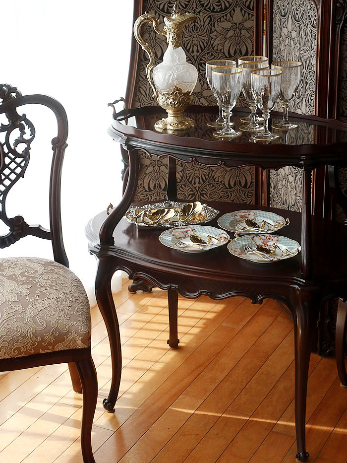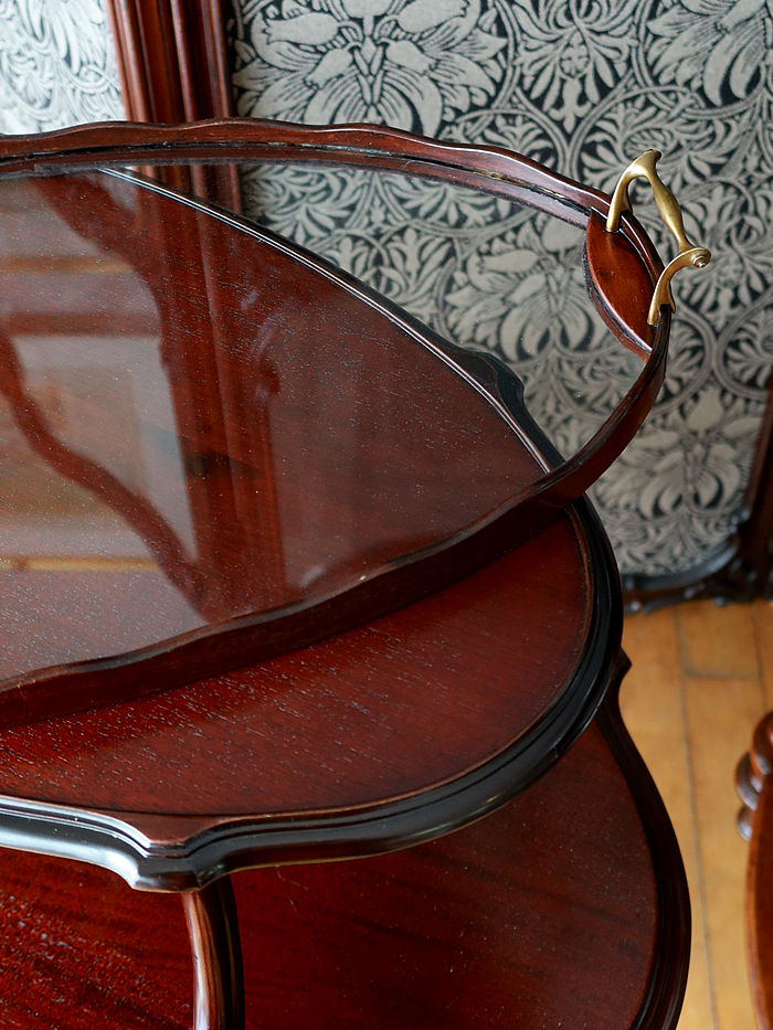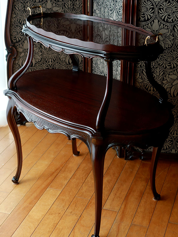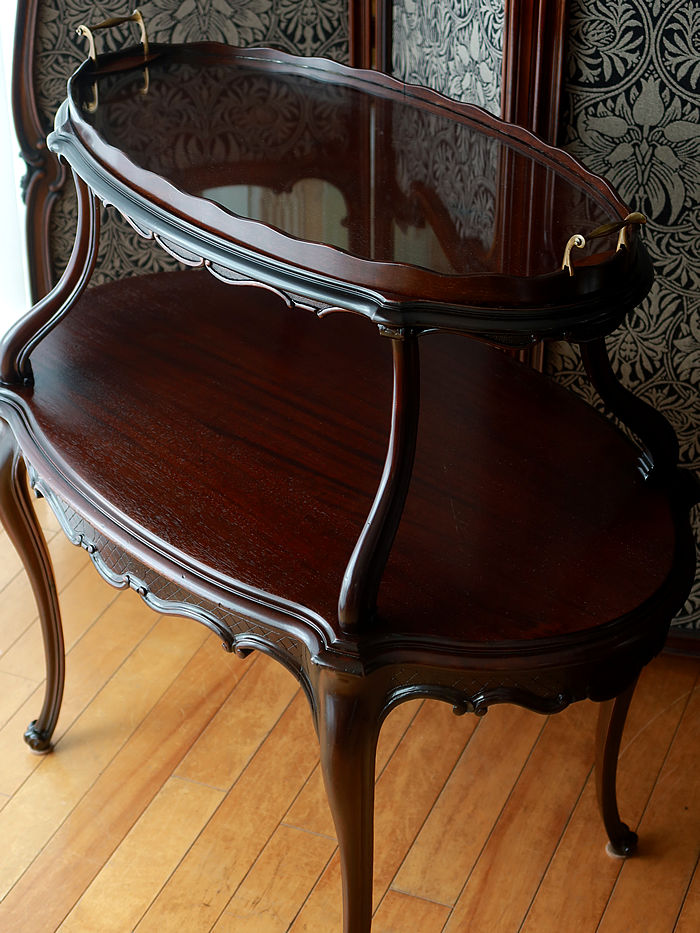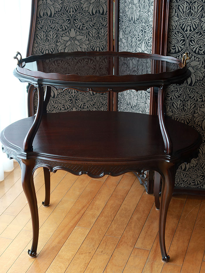 | マホガニーの上質な艶やかさが引き立つトレイトップテーブルです。二段のオーバル状のテーブルを重ね左右前後に曲線ラインの脚細工とテーブルの縁取りを飾るロカイユ紋様がリズミカルに飾られています。テーブルに重ねましたグラス天板のトレーは上段のテーブルサイズにぴたりと重なるように仕上げています。さらに左右のハンドルもトレーをそのまま持ち上げられる重宝な構造です。マホガニー素材の天板に直接、熱い器や冷たい器などを置かれるのはマホガニーの質感にダメージを与えますのでクッション効果とトレーを持ち上げサーヴィスされる動線にも役立つ効率の良いテーブルです。しかも二段構造の横長オーバルテーブルは器等々を並べるうえでも見た目も良く実用的にもダムウエイターに比べ様々な要件に応えてくれますトレートップテーブルです。ワゴンのようにもオブジェのような使い方にも幅広く対応できるトレートップテーブルです。※こちらの配送はお届けの際に別途送料をお見積りします。 |