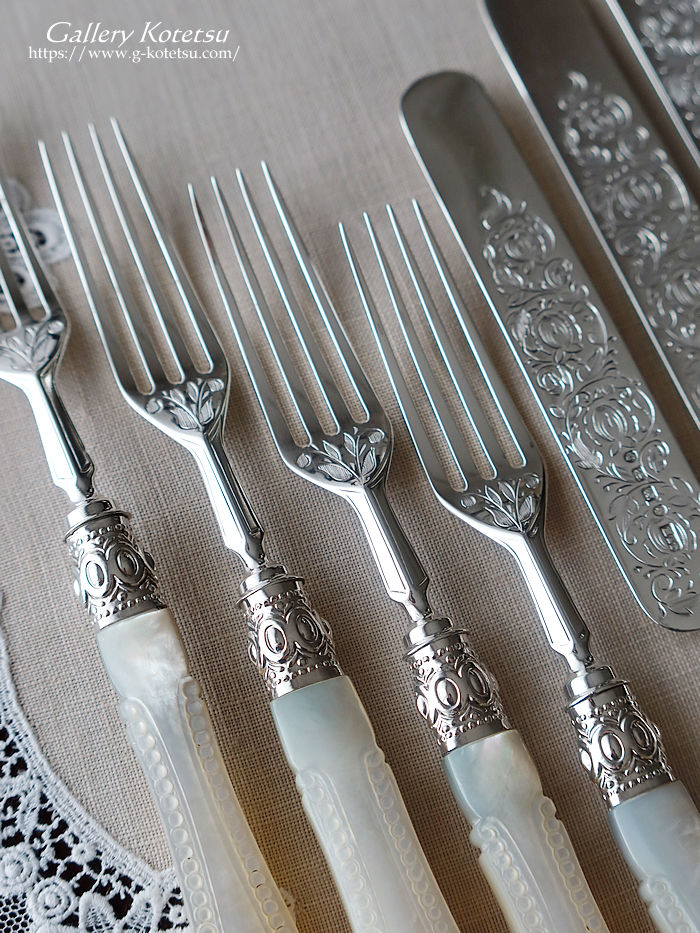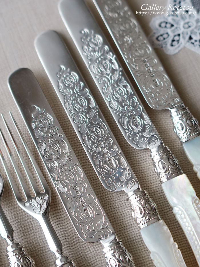 ヴィクトリアンスターリングシルバーのデザートカトラリー4名セットです。ヴィクトリアンスターリングシルバーのブレードに虹色の輝きが美しいマザー オブパールハンドルを合わせたデザートカトラリーです。 ハンドルに合わせた美しいマザーオブパールの縁取りを緻密なビーズ紋様で飾られ美しい輝きです。 ナイフブレードの先端をラウンドトップに仕上げブレ―ドとハンドルとの繋ぎ目を巻き上げる装飾モチーフと合わせたモチーフをブレード部分に彫り深いエングレーヴィング彩で飾られて います。