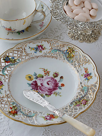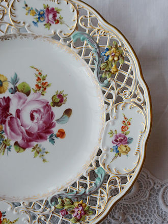レースのように縁どられたマイセンのデザートプレートに幾種類もの フラワーブーケ紋様を重ねています。