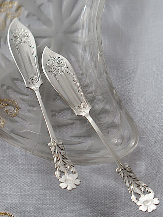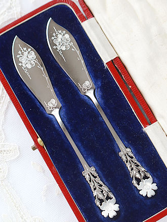 クローバーで飾られた弓なりブレードがキラキラとブライトカットで 輝いています。その愛らしい姿からすらりと伸びたハンドルトップの 一輪の花が咲き誇る様子をバターナイフに表現された シェフィールド1904年CooperBrothers&SonsLtdの赤い皮で仕上げた ボックスにペアセットで収納されています。 ブレードからハンドルへと華奢にみえますが重厚感のある仕上げが ハードタイプのバターにも最適ですがブレード部分の幅がエレガントな サイズですのでクリームティータイムにスコーンと合わせられても 華を添えるペア・バターナイフです。