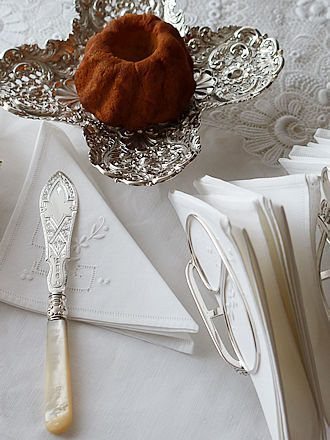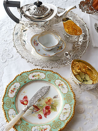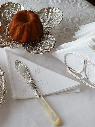 スターリングシルバーのシェフィールド1935年ThomasBradburry& SonsLtdのクランベリーグラスバスケットにクロテッドクリームor フレッシュジャムを用意しマイセンのインドの華ピンクローズシリーズの ケーキプレートで午後のお茶時間にティーセッティングです。 スコーンを保温するホワイトリネンにレースの縁取りを飾り愛らしい ワンポイント刺繍を施したスコーンホルダーに出会いました。 トップ部分に細工されたスナップボタンをパチン&パチンと重ねますと ふんわり広がる部分にひとつひとつスコーンをおさめられる可愛らしい バスケット形状仕上げです。 午後のティータイムにスコーンやマフィン等々ヴィクトリアン スターリングシルバーのバーミンガム1891年Hilliard&Thomasonの スコップ型ボウルと刃先が四本刃のフォークでジャムスプーンor プチサーヴィングに合わせます。 マザーオブパールハンドルの短めサーヴィングカトラリーはお茶時間に 重宝なサーヴィングセットです。 マザーオブパールハンドルの美しい輝きを保つバーミンガム1881年 Hilliard&Thomasonがマイセンのケーキプレートに程よいサイズです。