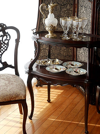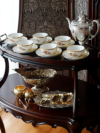すっかり落ち葉の季節になりました。 セピアローズ?と思っていましたがロイヤルコペンの “ブラウンローズ”のネーミングがついたティーカップ&ソーサー 6客セットでご紹介します。 バックナンバーの1953年&1957年を合わせた6名セットです。 その前にティーパーティーに役立つ嬉しい執事? 物言わぬ執事にダムウエイターを二段や三段からスクエアなどなど ご紹介しておりますが実際にお部屋のなかで重宝するのは トップにティートレー(ガラス面のテーブルを左右に補強されたハンドル 付き )を重ねたトレートップテーブルがひとつお部屋にあるだけで ティーセッティングの準備諸々の便利なこと。 虎徹の狭い店内でも撮影するアンティークを寄せてスペースを広々と 撮影スポットに気持ちを集中できる嬉しいテーブルです。