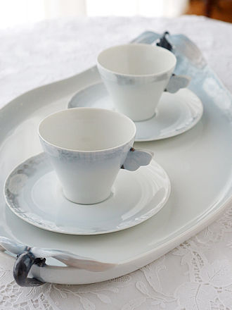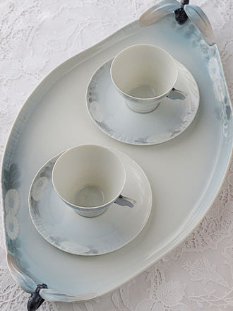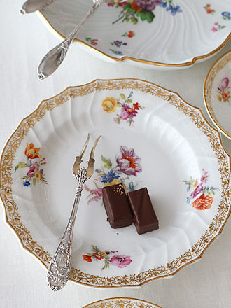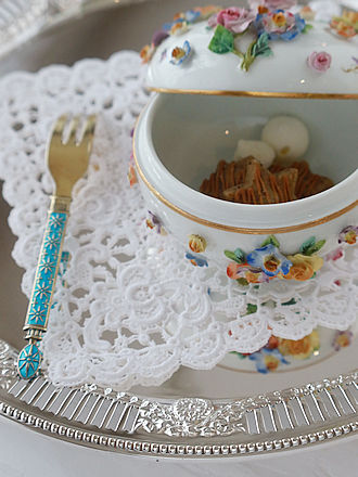 1月6日は「王様のお菓子」を意味するガレット・デ・ロワをいただく 公現祭ですが早々に年明けにアーモンドクリームのなチュールと 蜂蜜にアーモンドペーストと柚子のコンフィを入れたオレンジの 二層タイプの二種類を贅沢にも味わいました。 9月のイベントの時にお願いしましたCest.bo.er.Bonさんの 贅沢なガレットデロワに合わせた二つのシーンをご紹介します。 フェーブもトップにアレンジされキラキラです。 それぞれに似合うサーヴァーを合わせてみました。 英国古陶磁器のコールポート窯のトリオも見事なフラワーブーケ 紋様が浮き上がっています。