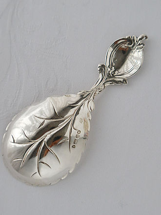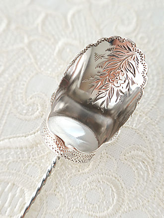 スコップ型のティーキャディスプーンを片手にお好きな茶葉を サクサクと取り出しませんか。 バーミンガム1896年WilliamDevenportの先端を愛らしい 花々のエングレーヴィングで飾りボウル部分の縁取りをフリルで 細工したスクリューハンドルのティーキャディスプーンです。 スコップ型と合わせヴィクトリアンスターリングシルバーの ティーキャディスプーンを幾つかご紹介します。
