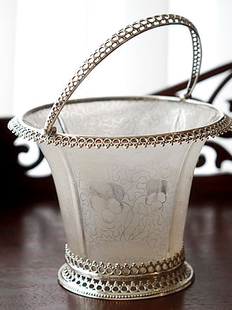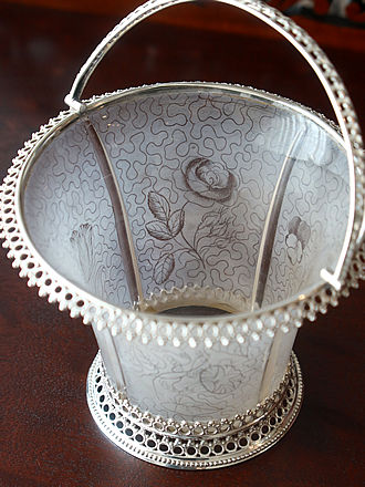 シェフィールド1901年MartinHall&Coが手掛けましたファンシー ケーキバスケットです。 花びら餅にもAMAM PLUSのキャラメルショコラを数枚重ねた スィーツアレンジなど色々楽しめるスクエアバスケットです。 ハンドルからバスケットの側面飾りのフリルを縁取った緻密な紋様には 薔薇をはじめとしたフローラル紋様が浮き上がっています。 さらに四方に飾られたCスクロール重ねも花々で可憐に飾られています。 フラット面が引き立つ鏡面仕上げがスィーツを輝かせてくれます。