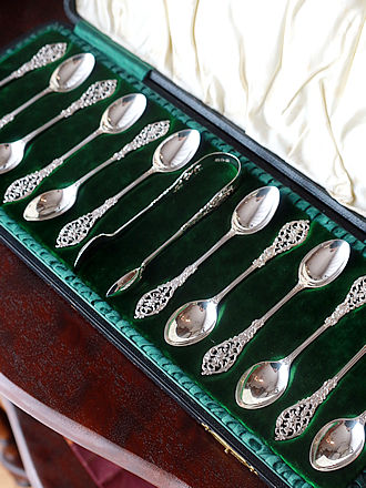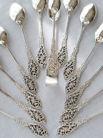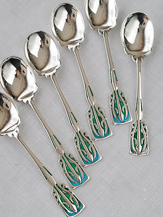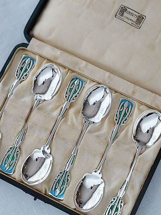 宝石のように煌めくエナメル装飾のスプーンやプリカジュールで 飾られたスプーン&輝石やギロッシュエナメル彩など スターリングシルバーでオーダーされたティーキャディスプーン& シュガースプーンです。 ひとつひとつ丁寧に仕上げたシルバースミス達は時代の流れと ともにオーダー主の趣向に合わせた繊細で特別なジュエリー装飾へ 販路を変えていきます。 プリカジュール&エマーユなど美しい宝石のようなスプーンです。