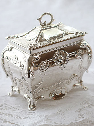 蓋を開ける摘みがくるりと輪を描いたようにシェルロカイユを ポイントに仕上げたスクエアスタイルのティーキャディ チェスター1906年GeorgeNathan&RidleyHayesに続きまして