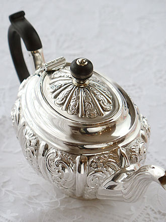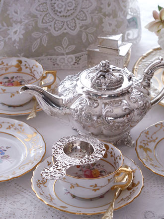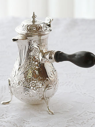 ロンドン1841年にRichardDevonshireが手掛けました お花の蓋摘みが象徴的なヴィクトリアンスターリングシルバーの ティーポットです。 ヴィクトリア時代に作られたティーポットの特徴的なフット部分の 装飾方法をご覧ください。 ティーポットの底面を台座で支える四本のメダリオン装飾のフットが 美しく仕上げられています。 ボディを飾るCスクロール紋様の面取りに薔薇を浮き上がらせた エレガントな雰囲気をティーポットのお花の蓋摘まみからハンドル& 注ぎ口へと飾られハンドルを持ち上げますと美しい弧を描きながら 紅茶を注ぎ入れる場面をイメージしながらヴィクトリア時代の貴婦人の お茶の時間を想像してください。