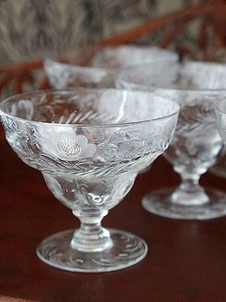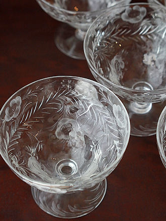 英国のトーマスウエブが手掛けました可愛らしいスタイルの グラスをご紹介します。 タンブラーに続き「可愛い!」と持ち帰ったグラスです。 口径93mmに高さが80mm のグラスにフルーツ等など。 持ち上げる時は台座の上に優しくゆっくり指をかけて、 シャンパンクープ?としてオーダーされたのでしょうか。 側面をご覧いただきますとトップから緩やかな断層が台座へと 流れるラインが美しいです。