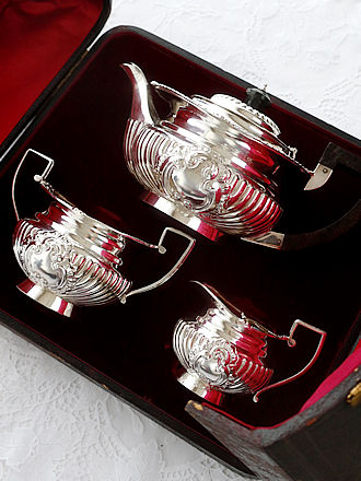 オリジナルのボックスに収納されましたチェスター1895年 GeorgeNathan&RidleyHayesのティーサーヴィスセットです。 ヴィクトリア時代の最も人気を集めたティーサーヴィスセットの スタイルとして葉の側面に挟まれたシェルラインが飾られています。 持ち手部分が曲線ラインを多くみかけますが直線的なラインと フット部分をしっかりと円形の台座で支えています。 ティーポット&ミルク&シュガー入れの上部を飾るシェルのポイントに スクロール紋様をアクセントに加えていますので真上からも美しい 細工を楽しめます。