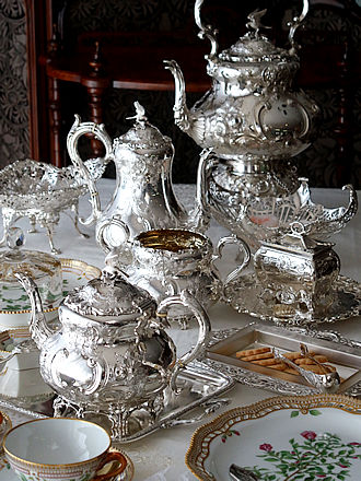5月にご案内しております「マリーアントワネットの愛した 離宮プチ・トリアノンでティータイム」にたくさんのお申し込みを いただき有難うございます。 ルイ王朝時代の食文化からアンティークシルバー等々を重ね合わせ あれこれ妄想中です。 ご紹介しますのはロンドン1878年MartinHall&Coが手掛けました ルイスタイルのティーサーヴィスセットです。 ルイ14世の太陽王を象徴するかのごとくヴィクトリア女王即位後の 目まぐるしい発展を遂げた英国のシルバースミス達の技が見事に 引き出されています。 英国のヴィクトリア時代の華やかなりし時代と重なったスタイルです。 フランスのルイ王朝時代の銀器などなどは革命とともに散逸しましたが 当時のルイ王朝を象徴する英国銀器の傑作ともいえますティーケトル& ティーポット&コーヒーポット&ミルクジャグ&シュガーボウルを揃えた ティーサーヴィスセットをご紹介します。