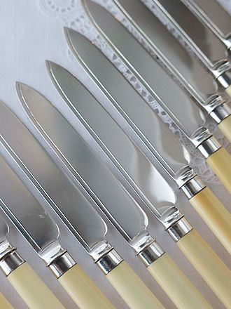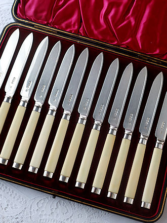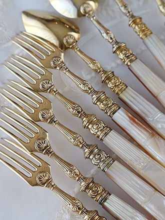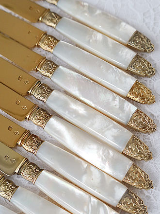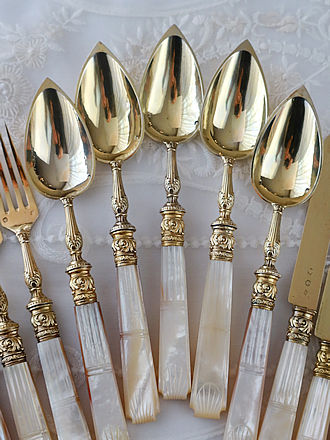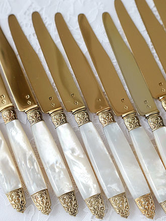 マリーアントワネットの愛した離宮プチ・トリアノンでのお茶の時間を イメージしながら出会いましたフレンチシルバーのデザートナイフです。 Paris800銀のメゾンLBが手掛けました上質なマザーオブパール ハンドルにシルバーのブレードをヴェルメイユで覆い繋ぎ目とハンドル トップの装飾部分を飾ったデザートナイフです。 ボックスのなかに15本が納められています。 これは想像ですが同様の15本を収めたボックスが数個ほど 収納されていたのではと思います。
