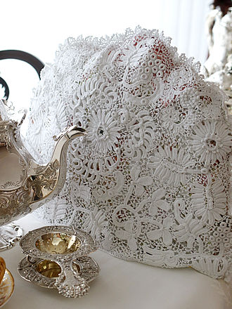 2026年新しい年を迎えました。 皆様はいかがお過ごしになられましたでしょうか。 お蔭様で大雪にも見舞われず大晦日から年明けをゆっくり過ごしました。 ほとんど引きこもり?に近い日課を過ごし家の中の整理整頓?と 目標を定めましたが目標の半ばで終了です。 まとまった時間が取れる時に始めたのですが、これは何々? 虎徹で紹介しよう!これは皆様のお好みではない? 誰が集めていたの?と自問自答の日々を過ごしていました。 あらためまして今年もアンティークギャラリー虎徹をどうぞよろしく お願い申し上げます。 昨年末に届きましたアンティークレースのティーコージーカバーを アップルカラーのティーコージーに重ね宿り木のエナメル彩が 浮き上がるグラスをサルヴァに合わせました。 宿り木の花言葉は厳しい冬でも緑を保ち他の木に寄生して生きる 強い生命力から困難に打ち克つ・忍耐・克服とも 幸運・魔除けの象徴とされ神聖な宿り木のグラスをロンドン1890年 SibrayHall&Co のサルヴァに重ね祈願?します。