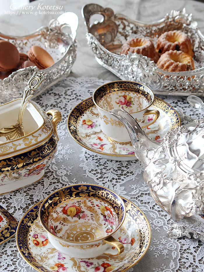 英国コールポート窯のコーヒーカップ&ソーサーです。シャープなアンギュラーハンドルを金彩で覆い円柱型に仕上げたボウルの内側を飾る鮮やかな花絵付けからコールポート窯と推測しますが窯印がなくノーマークです。焼き地の質感から想定しますと1820年後半に製造されたティーサーヴィスセットであったことをイメージさせます。ハンドペイントで描かれた薔薇の花びらや表情等とコバルトブルーの五連輪繋ぎ文様をボーダーに緻密に仕上げ金彩紋様のコンディションも美しくソーサーの中央は金彩紋様を描きフラットに仕上げています。 |