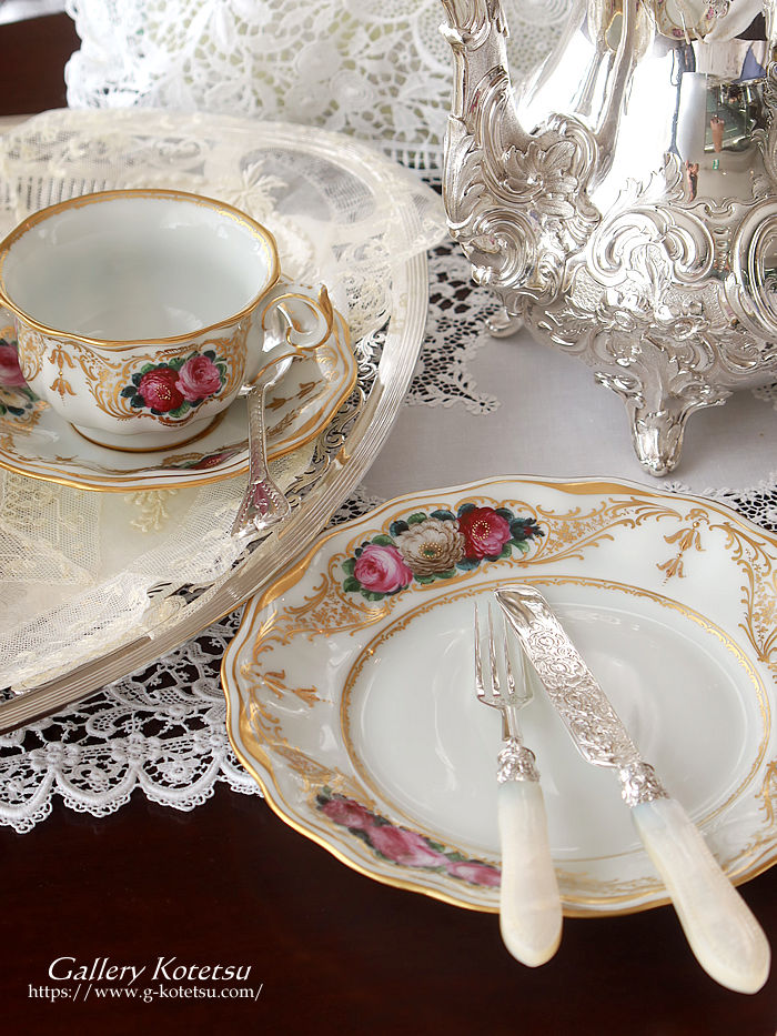 フュルステンベルク窯(Porzellanmanufaktur FURSTENBERG)のティーカップ&ソーサーにケーキプレートが組み合わされたセットです。ドイツ北部ニーダーザクセン州の小さな街「フュルステンベルク」に工房を設立したドイツ7大名窯のひとつです。フュルステンベルクでは、1747年の設立以来、その時代時代の美意識や生活様式を反映した磁器を製作し多角形のシェイプが美しいグレック(GRECQUE)ともビーダーマイヤー様式のティーセットとして1840〜1850年ごろにデザインされました。こちらのティーカップ&ソーサー&プレートセットには縁取りを金彩ぼかしで飾り曲線ライン状に薔薇を二輪向き合わせをロココ調の金彩窓紋様のなかに描かれています。ハンドルのくるりと巻き上げたスクロールハンドルも愛らしい表情です。