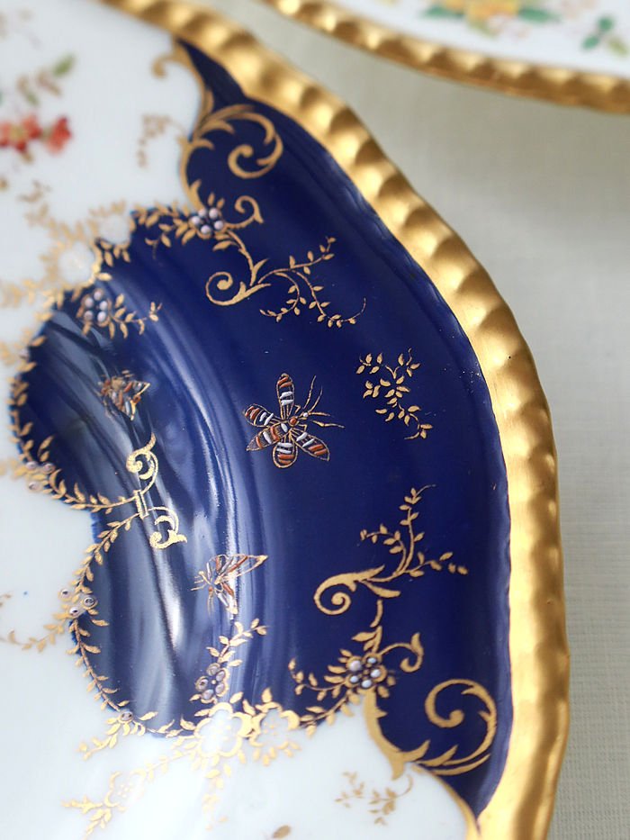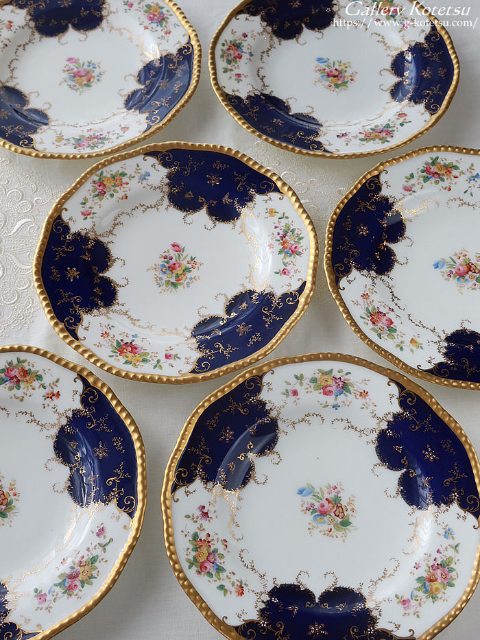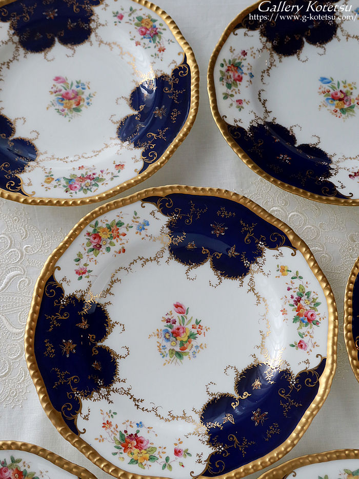 | 英国コールポート窯デザートプレート直径230mmの6枚セットです。コバルトブルーと白磁を重ねたうえにプレートの縁取り部分を厚みのある金彩縄編み紋様で飾られています。中央部分から三方に広がる白磁窓紋様の中央部分を風にたなびく愛らしいイングリッシュガーデンブーケを飾りコバルトブルー地の窓紋様に描かれたミツバチと小花紋様をホワイトエナメルジュールで立体的に仕上げ金彩エナメルのスクロール紋様で上品に仕上げています。イングリッシュガーデンティータイムをイメージするイングリッシュローズをはじめとした花々が愛らしいデザートプレートセットです。 |