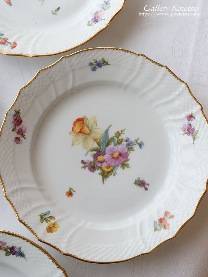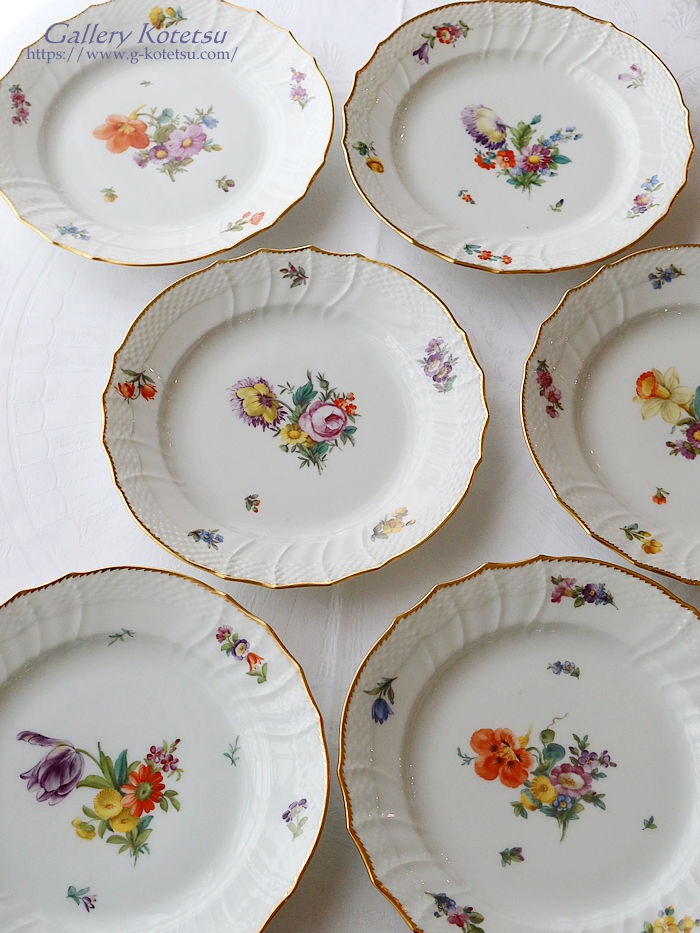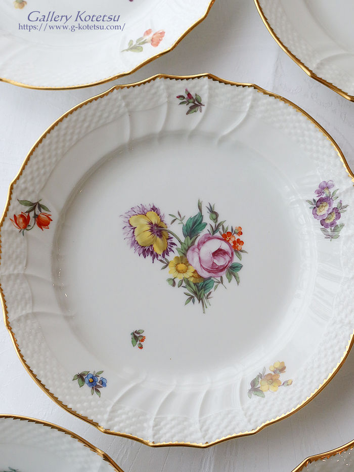 ロイヤルコペンハーゲンのSaxonFlowerシリーズから直径22pのデザートプレート6枚セットです。 ロイヤルコペンハーゲンの独特な色絵付けで描かれたフラワーブーケ紋様に金彩の縁取りをラインのみのライトから筋状紋様を縁取ったリッチタイプです。時代も1936から52年に製造された年代マークが記されています。