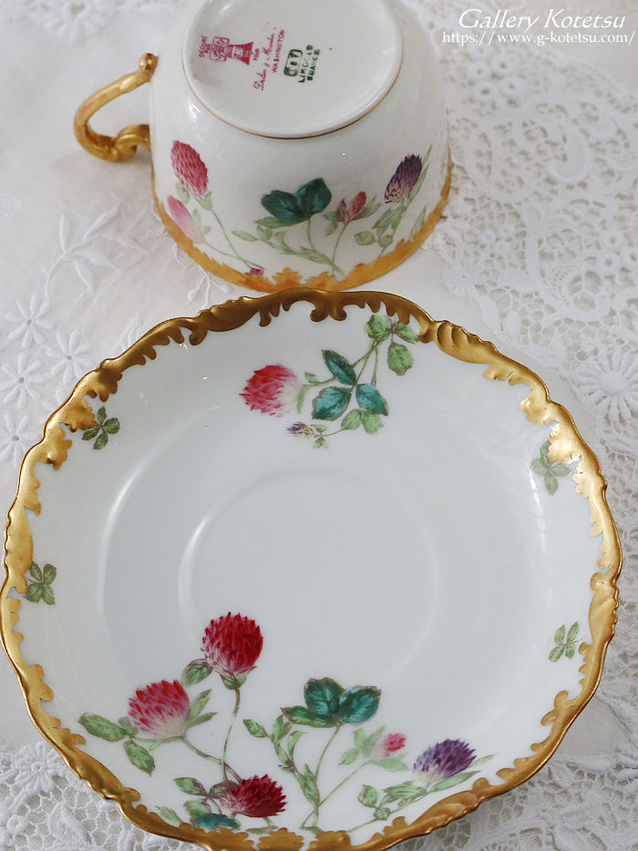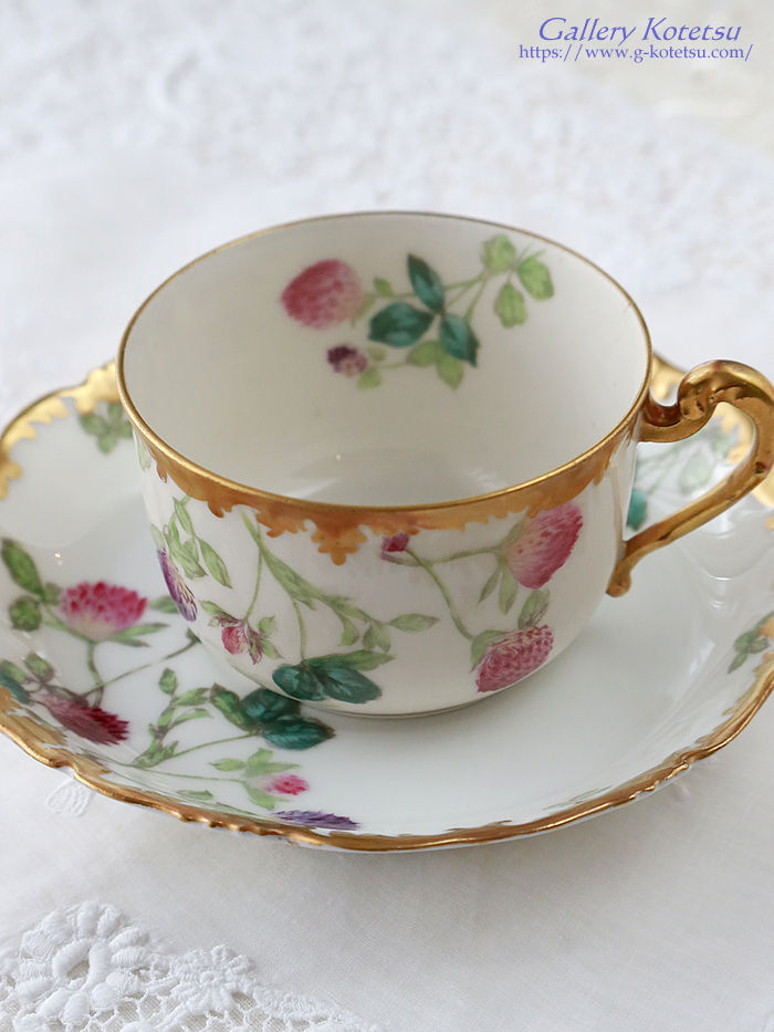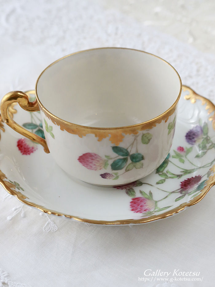 | ムラサキツメ草を描いたティーカップ&ソーサーです。 C.1890年フランスのリモージュTressmann&Vogtが描くムラサキツメ草がナチュラルにのびた茎から葉へと自由自在に咲き誇る様子をティーカップの外側から内側&ソーサーに描いています。ティーカップの口元部分&ソーサーの縁取りを金彩エナメル彩で飾っています。さらに金彩で覆われたハンドルカーブも持ちやすく模られています。