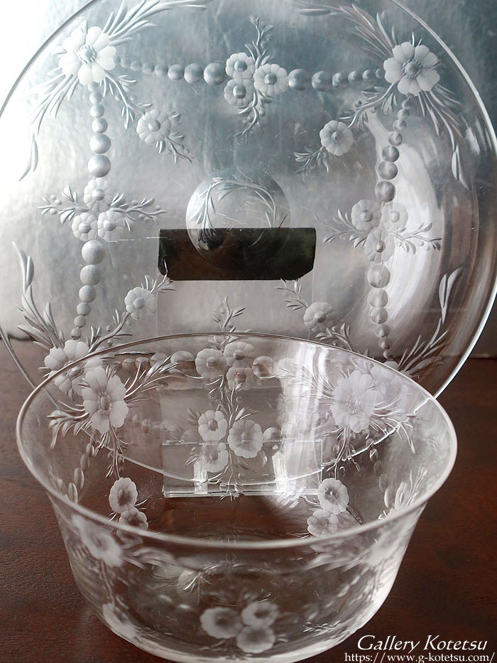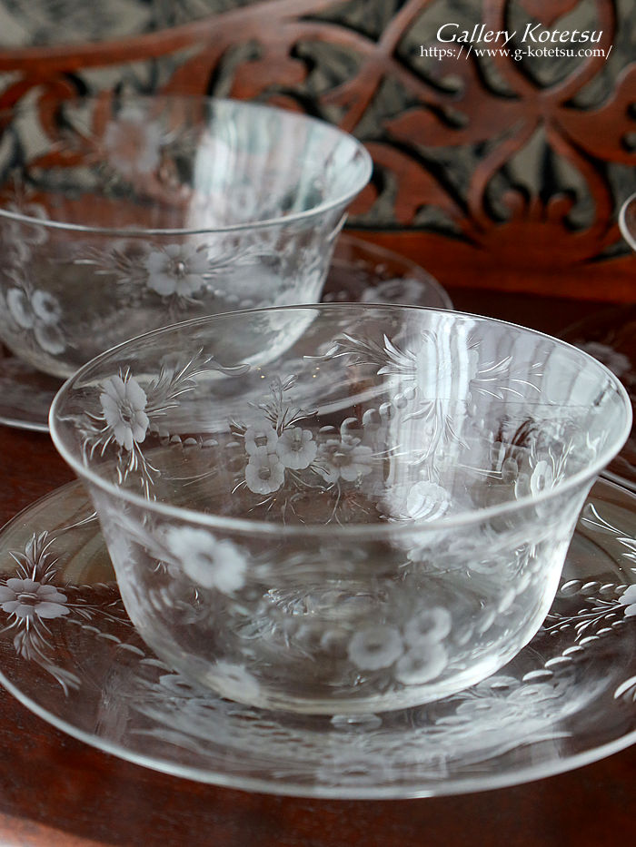 | 英国のグラス工房スティーブンウィリアムスが仕上げたボウル&ソーサー6客セットです。 ナチュラルなグラヴィールで仕上げた花の精を思わせる幻想的な表現方法に思わず目がとまります。口径をゆったりと仕上げたグラスボウルに合わせるように仕上げられたソーサーを重ねますとガーランド紋様が浮き上がりセッティングが際立つ美しいボウル&ソーサーセットです。