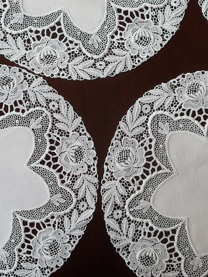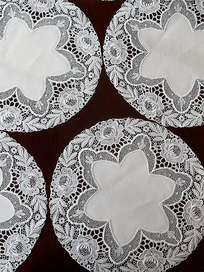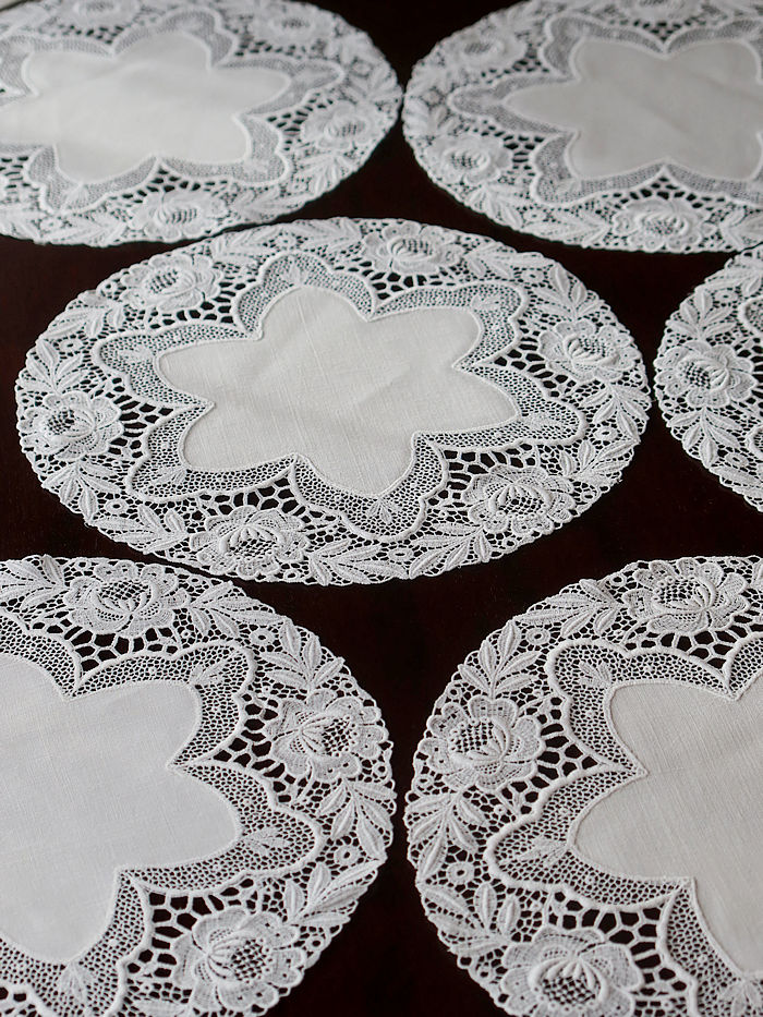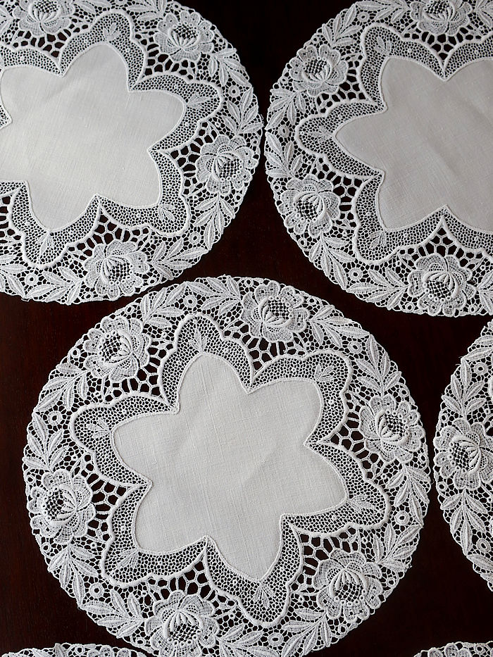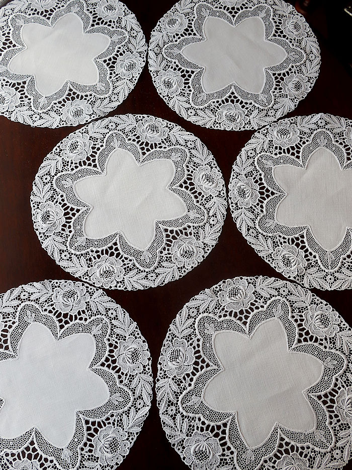 ホワイトリネンを中心に縁取りを見事に咲き誇る大輪の薔薇&左右に広がる葉を2本の糸をツイストしたネット刺繍で繋げたドイリー6枚セットです。内側へと細かなネット刺繍で縁取り星形のリネンへと繋げています。ポーセリンのプレートがとても貴重な時代にプレートを重ねる際にクッションとして必要とされたドイリーですが、それぞれ美しいレースを施しています。
