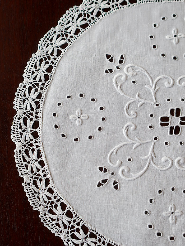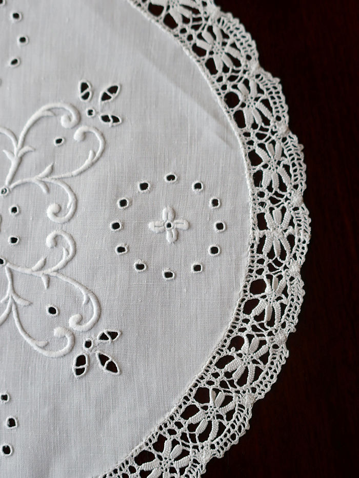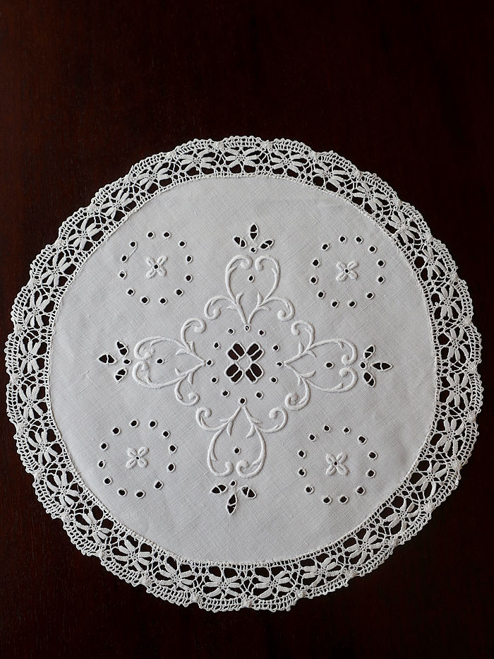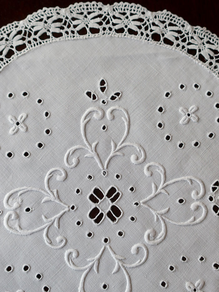 ホワイトリネンのラウンドレースを飾る立体的に仕上げた刺繍とカットワーク刺繍を中心に飾り縁取り紋様を方形の緻密な積み重ねを編み目で飾られています。サルヴァやトレーなどに重ねられますと刺繍が引き立ちます。