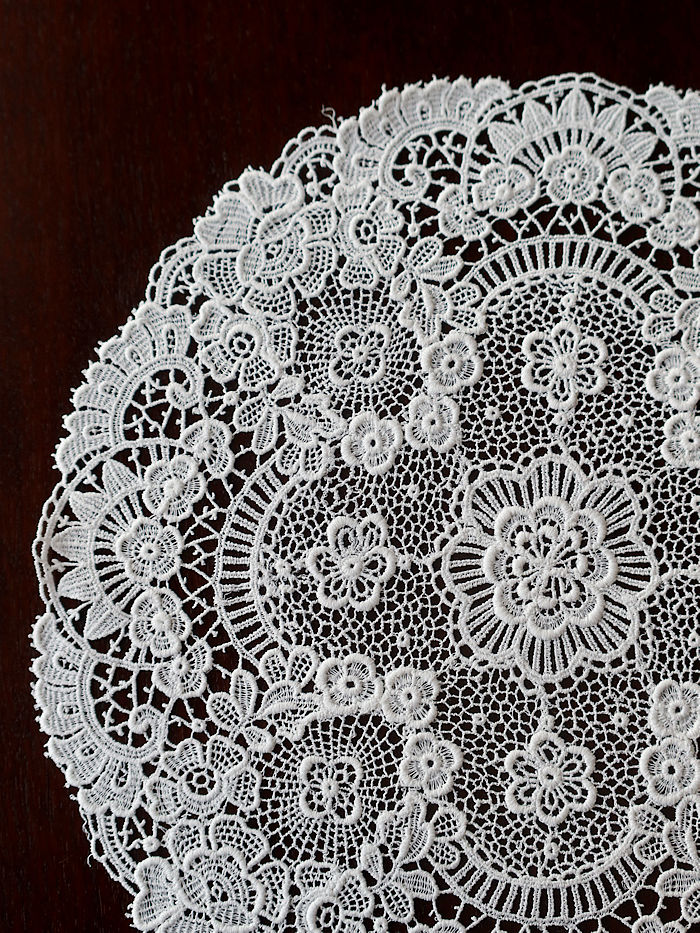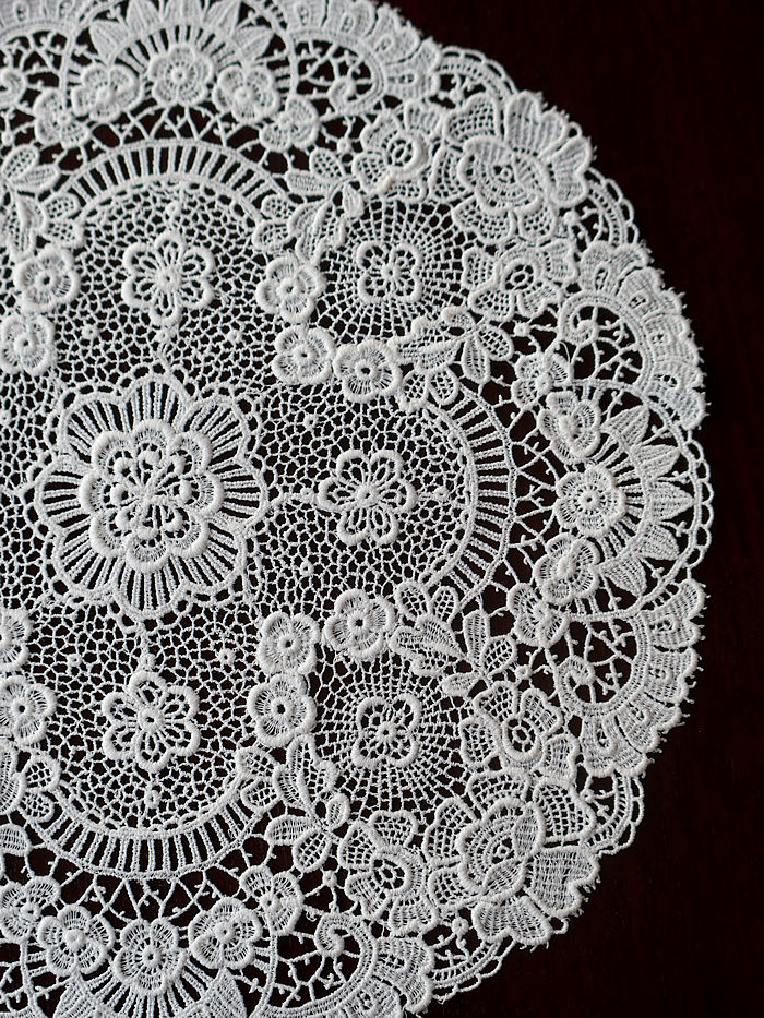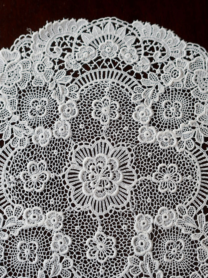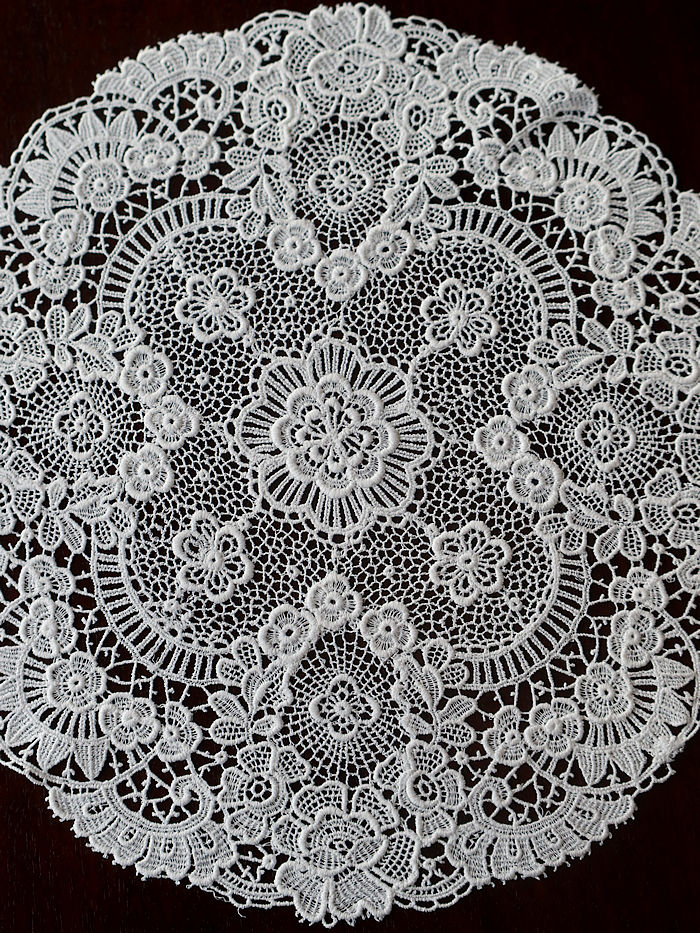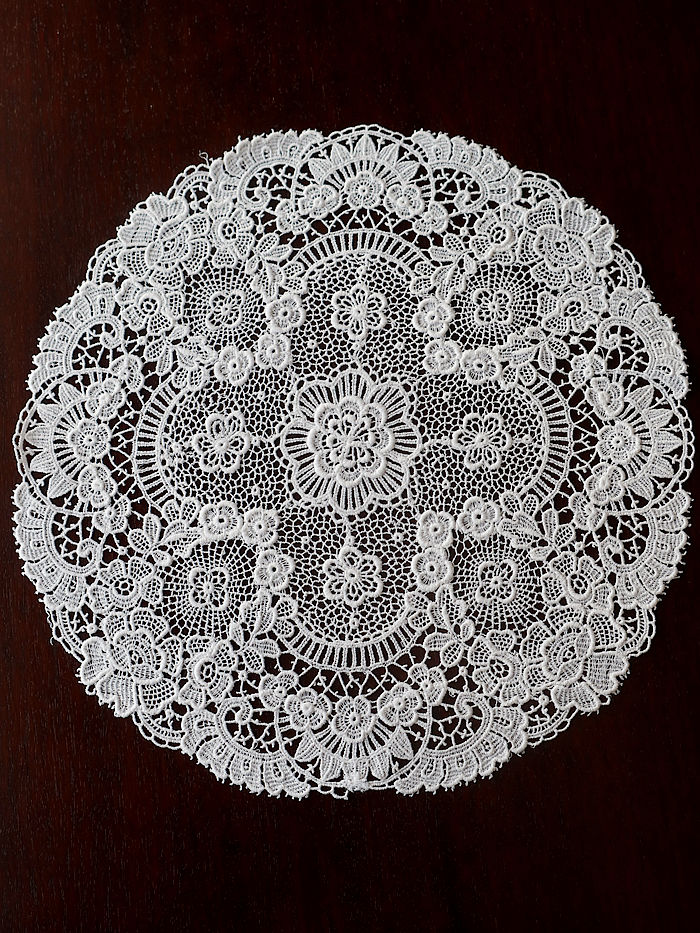 大輪の薔薇紋様を中心にニードルレースで前後左右に繋げ縁取りには小花のガーランドで囲みあげたラウンドンドレースです。サルヴァに重ねられますと薔薇紋様が浮き上がるように美しいです。