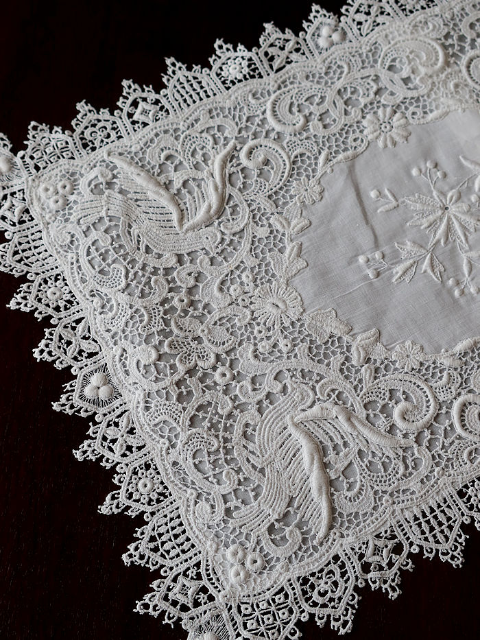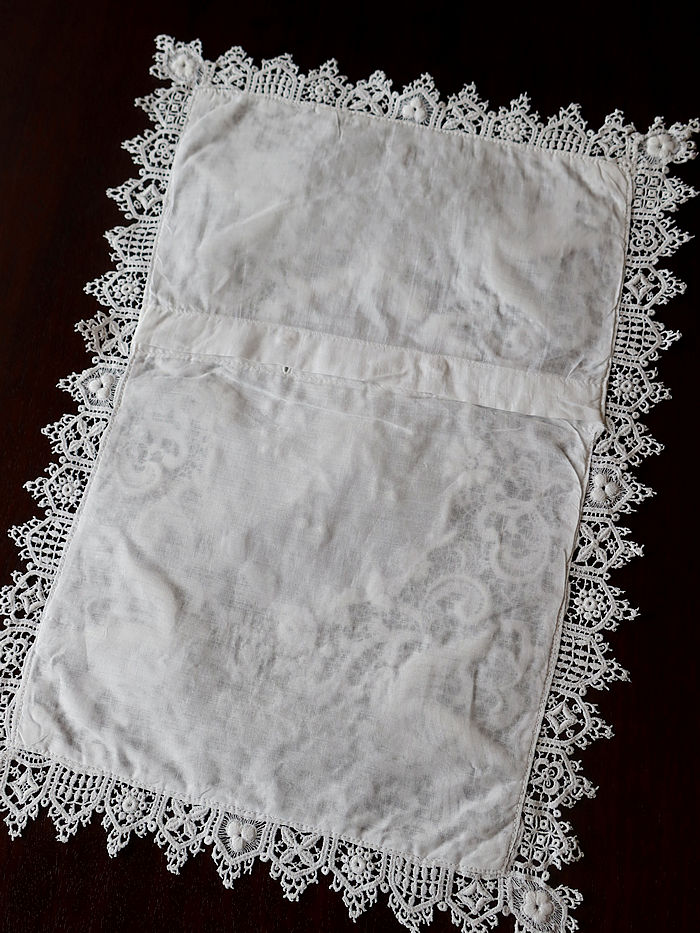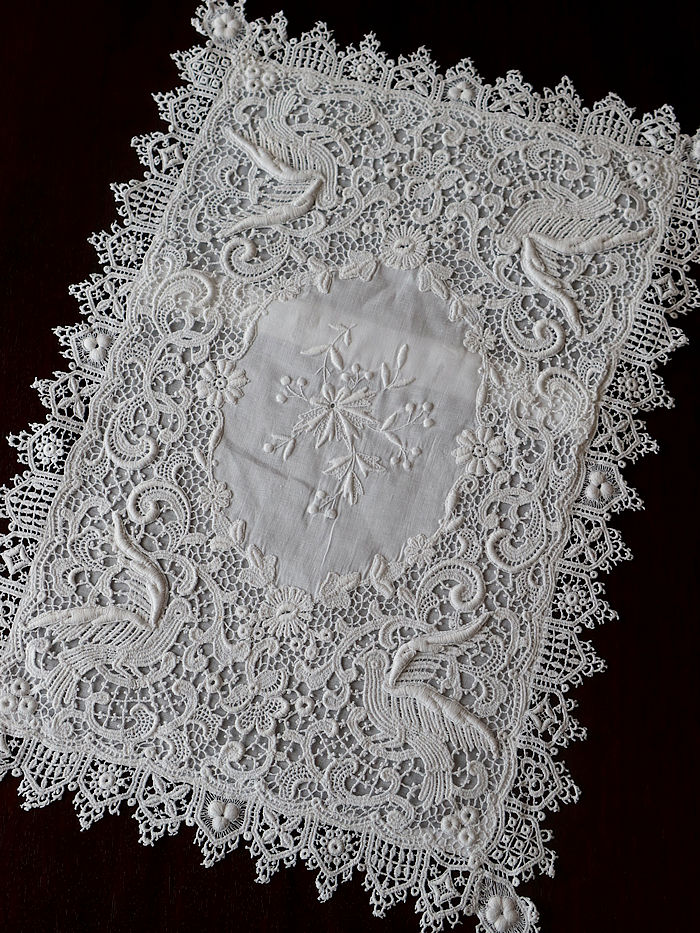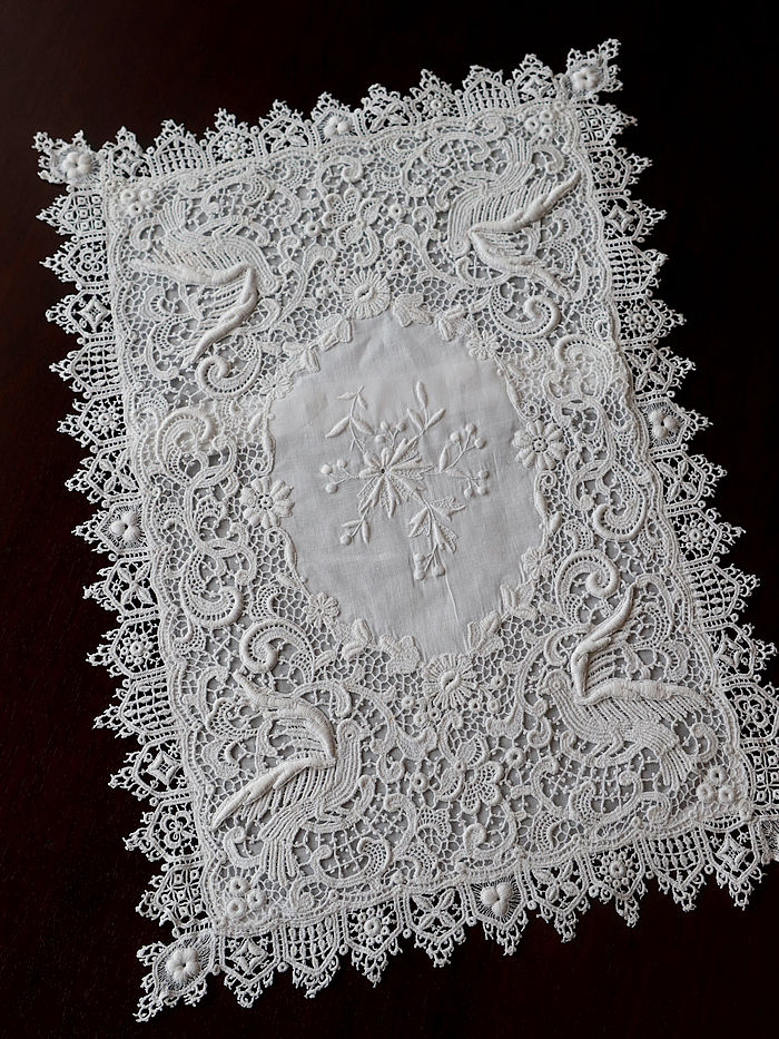 ホワイトリネンに刺繍を施しそのまわりを糸の芸術とも言われますローズポワンでバードの羽根の盛り上がりからフローラル紋様の曲線部分を浮き彫り彫刻のように精密に仕上げた美しいサシェです。ポプリを収納した18世紀のレディのお部屋に置かれていた大切で貴重なサシェです。サシェの縁取り飾りにはプント・イン・アリアという糸のみで仕上げたことから空中ステッチとも言われる繊細なニードルレースを飾っています。 350×250mm