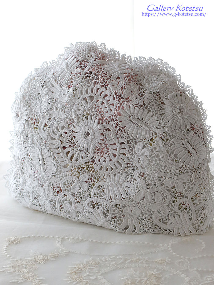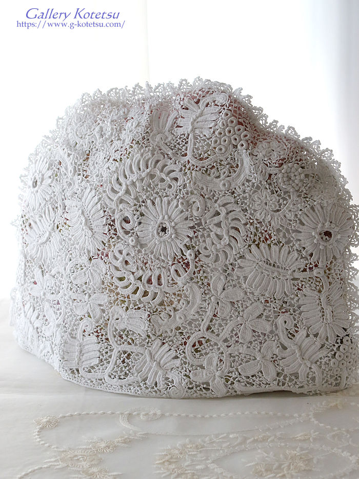 | アイルランドの美しいアイリッシュクロッシェを優雅で大胆なモチーフで編み込まれたティーコージーです。フランスからアイルランドに伝えられたとされます鎖編みの上に小花を飾ったかぎ針手法で薔薇&シャムロックなどバランス良く全体に飾られています。イギリスのレースの中でも独特なモチーフで仕上げた胸元を飾るレースを多くみられます。ティーコージーの左右&上下と緩やかに広げられますので平面サイズのリネンよりも若干膨らみを出せます。※レースのティージーカバーに合わせた中綿クッションを重ね保温性を高めてください。