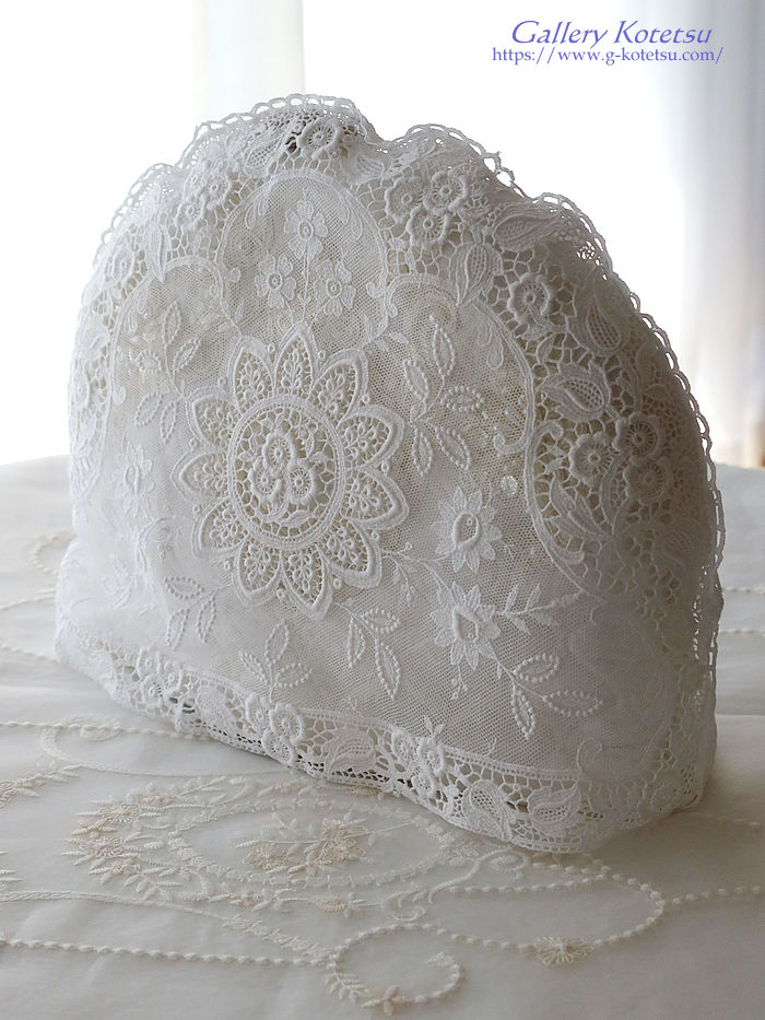 ホワイトカラーの様々な手芸レースで仕上げたティーコージーです。中央の円環紋様を中心にチュールレースで重ねた幾種類もの花々紋様で飾り全体を囲むようにフローラルモチーフをアプリケット仕上げで縁取られています。※レースのティーコージーカバーに合わせて中綿クッションを重ね保温性を高めてください。
