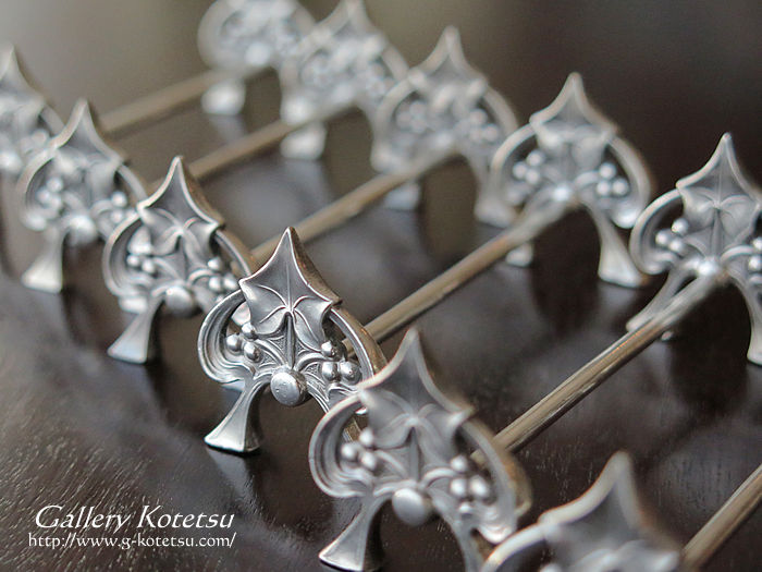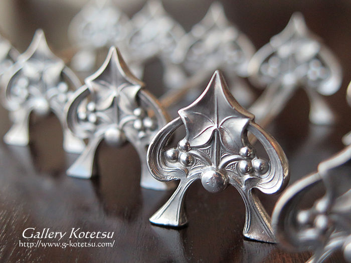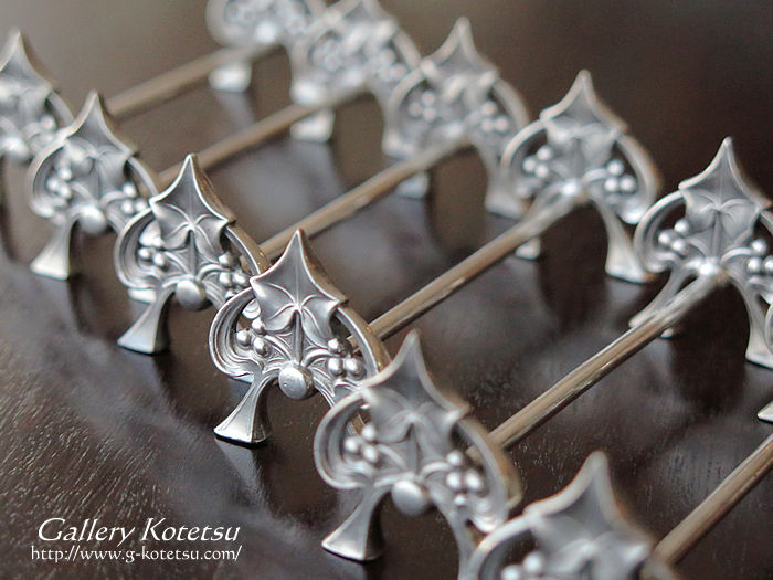 シルバープレートのナイフレスト6個セットです。アイビーモチーフを左右に飾り、バーの長さもデザートナイフ&フォークに合わせやすい小ぶりサイズです。バーの裏側に工房のマークが印されていますがヨーロッパ諸国のシルバー工房であるところまでの判読です。