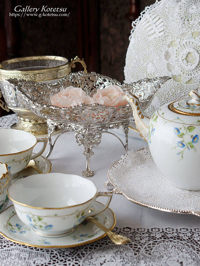 英国スターリングシルバーのエレガントな装飾を得意としますシルバースミスJamesDixon&SonsLtdが手掛けたデザートディッシュです。小判型のディッシュを飾る緻密なCスクロールのビーズ紋様をディッシュの縁取り全体に重ねリーフ紋様と小花紋様をアクセントの縁取られています。前後左右に膨らみを持たせたディッシュ面全体をリーフスクロールの透かし紋様を繋ぎ合わせながらフラット仕上げのディッシュ面へと包み込むように仕上げています。ティーテーブルやコンソールテーブルなどセンター飾りに引き立つ優雅なリーフスクロール&シェル紋様のフット装飾がティータイムを楽しませてくれます。