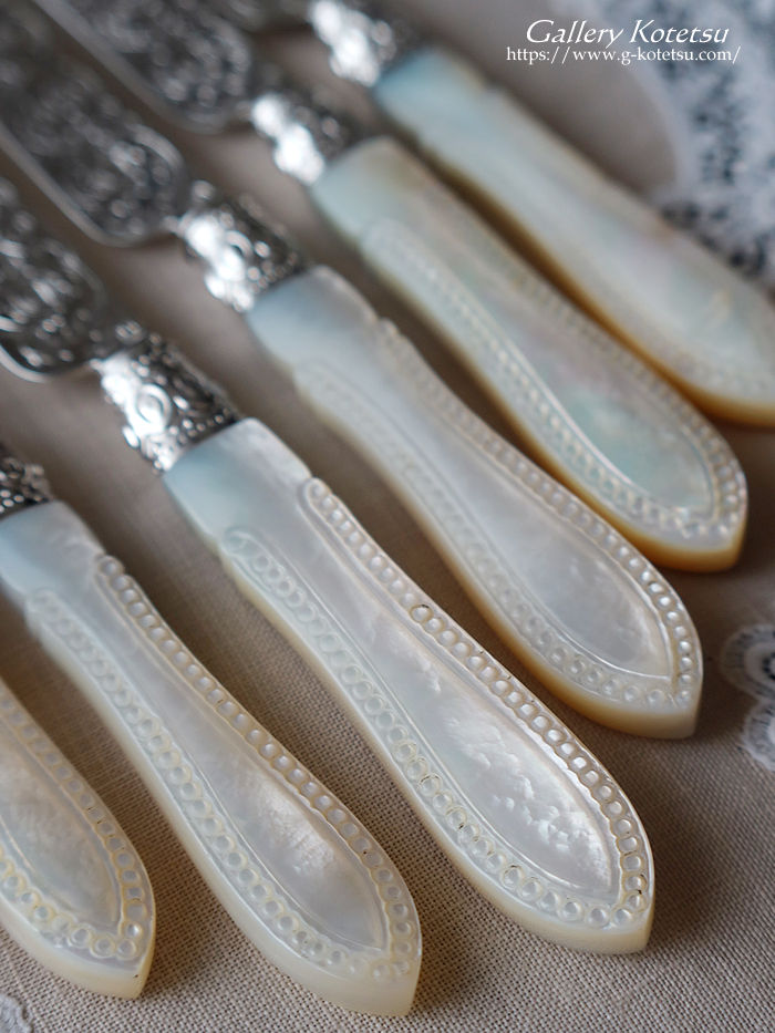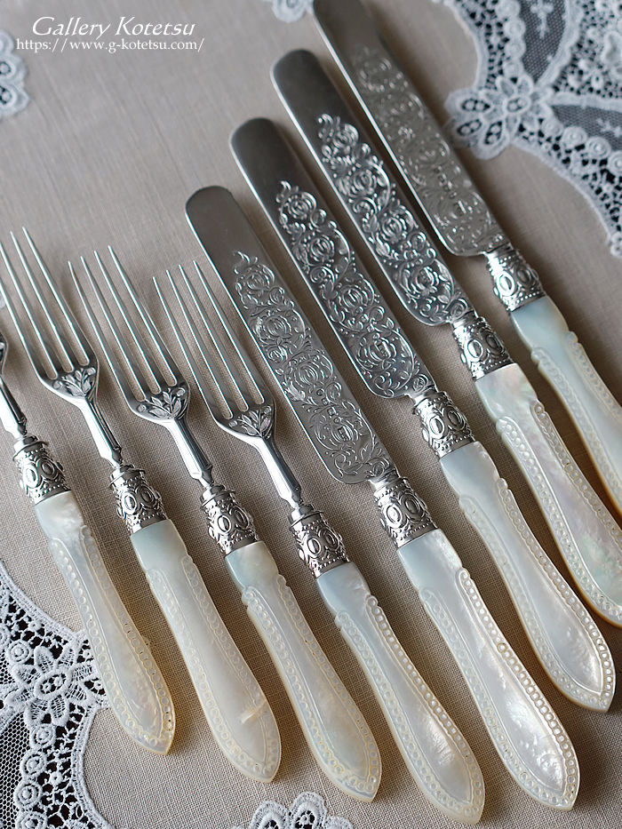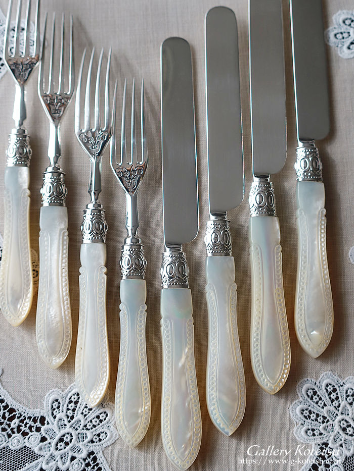ヴィクトリアンスターリングシルバーのデザートカトラリー4名セットです。ヴィクトリアンスターリングシルバーのブレードに虹色の輝きが美しいマザー オブパールハンドルを合わせたデザートカトラリーです。 ハンドルに合わせた美しいマザーオブパールの縁取りを緻密なビーズ紋様で飾られ美しい輝きです。 ナイフブレードの先端をラウンドトップに仕上げブレ―ドとハンドルとの繋ぎ目を巻き上げる装飾モチーフと合わせたモチーフをブレード部分に彫り深いエングレーヴィング彩で飾られて います。