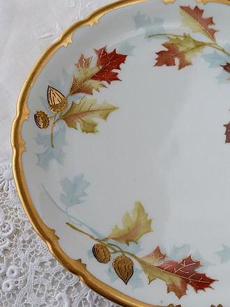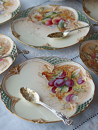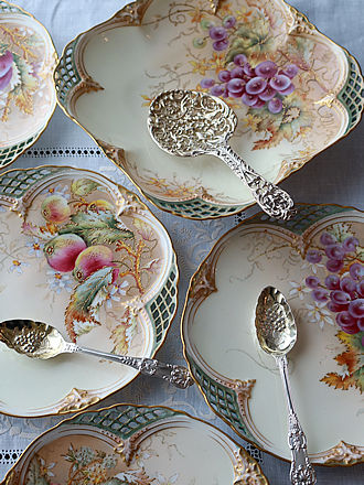秋は果物の美味しい季節です。 札幌市内は熊の出没したニュースがあちらこちらで報道されています。 実りの秋とともに庭に現れた小熊が多く、お庭の葡萄棚や花梨の木を 伐採されたお宅が多くなりました。 せめてテーブルの上にロイヤルウースターのフルーツペインター達が 見事に描きましたフルーツを幻想的に描いたデザートセルヴィスセットを 並べ実りの秋を満喫中です。 プレートの三方に透かしの窓紋様に合わせロイヤルウースターの独特の ブラッシュアイボリー地に描かれた葡萄や花梨やザクロなどなど 枝の表情から葉の色づく変化を描いたうえに金彩ジュールをきらきらと パウダーのように覆った絵付けは幻想的でもありナチュラルな色彩を 巧みに仕上げたロイヤルウースターの栄えあるフルーツペインター達の 傑作です。 一緒にジョージアンの頃にオーダーされましたフルーツスプーンをそっと 重ねます。