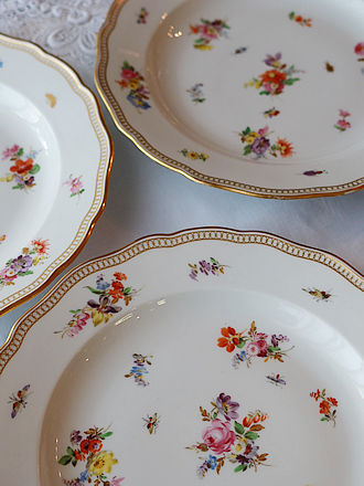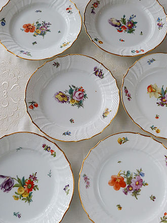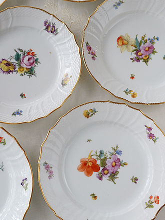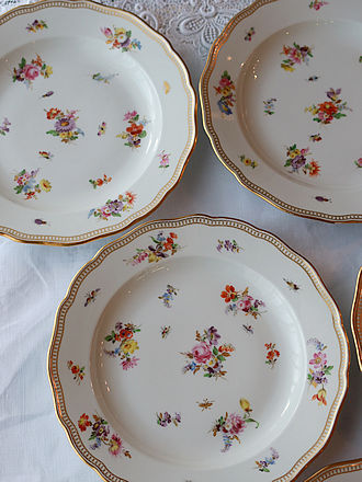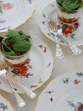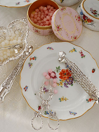 レースのように縁どられたマイセンのデザートプレートに幾種類もの フラワーブーケ紋様を重ねています。