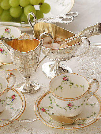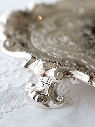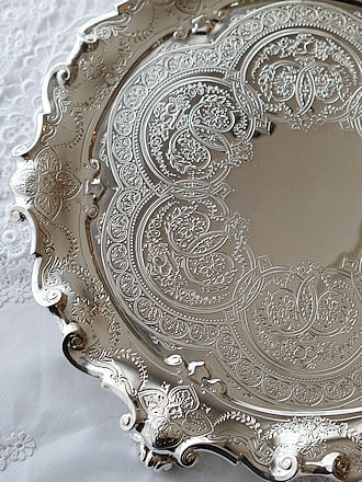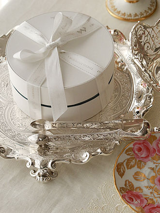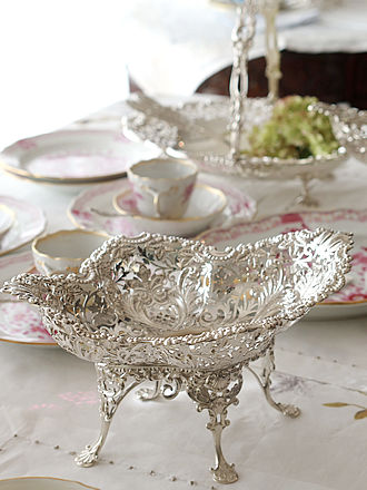 イパーンやケーキバスケットを合わせたテーブルセッティングに 不思議と似合うWilliamHutton&SonsLtdです。 ハンドルからバスケットの縁取りなど着席した時に必ず目に留まる 巧みな装飾が美しいです。 透かし紋様のハンドルにアカンサス葉を模るフットを低めに仕上げた オーバルバスケットの縁取りを優美な扇状の透かし紋様で飾られた ロンドン1906年WilliamHutton&SonsLtdが手掛けました。 オーバルバスケットは優雅なモチーフのなかにも華やかさを加え スィーツ等々を盛り付ける鏡面仕上げが盛り付けを引き立てる 丁寧な鏡面装飾技法が引き立っています。