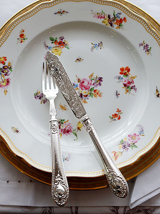 マイセンの金彩幾何学文様で縁取られたディナープレートと MartihHall&Coの緻密なエングレーヴィングで飾られましたフィッシュナイフ& フォークセットでセッティングです。 シェフィールド1868年まさにヴィクトリア時代の栄華を感じさせるブレード装飾 からハンドルへとシェルロカイユが見事に仕上げられています。 マイセンのディナープレートに重すぎず軽すぎず似合います。 フィッシュナイフの形状ですがブレード幅がシャープに仕上げられフォークの 四本刃の深みを持たせた形状や程よいカーブが口元に優しいカトラリーです。