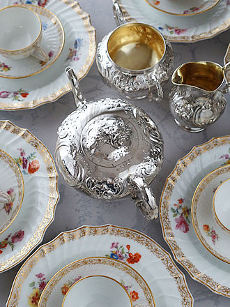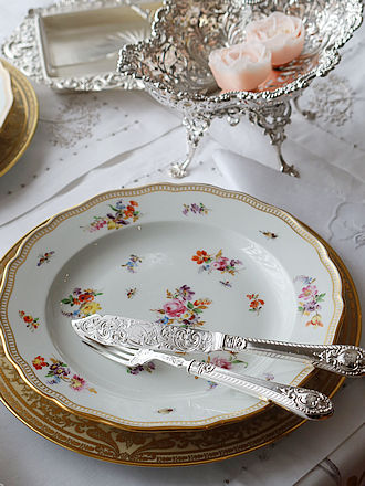 風にたなびく様子を中央のマイセン白磁に描いたフラワーブーケ紋様と 小花を散りばめたデザートプレートをテーブルにセッティング しますと 色鮮やな花々が目に飛び込んでいます。 透かし紋様を編み目仕上げ状に仕上げた幅広いレースの縁取り部分にも 3つのロカイユ窓紋様に描かれましたミニフラワーブーケ紋様が 色鮮やかに花開いています。 お花尽くしをテーマにマイセン&ドレスデンを組み合わせたお茶の 時間にマザーオブパールの輝きを放つマザーオブパールハンドルの デザートカトラリーを合わせガーデンティータイムです。